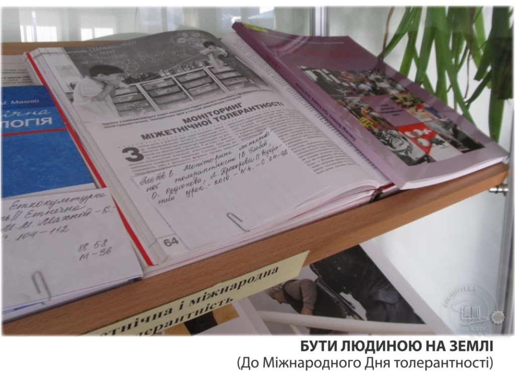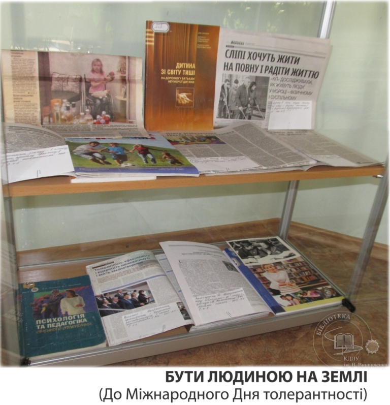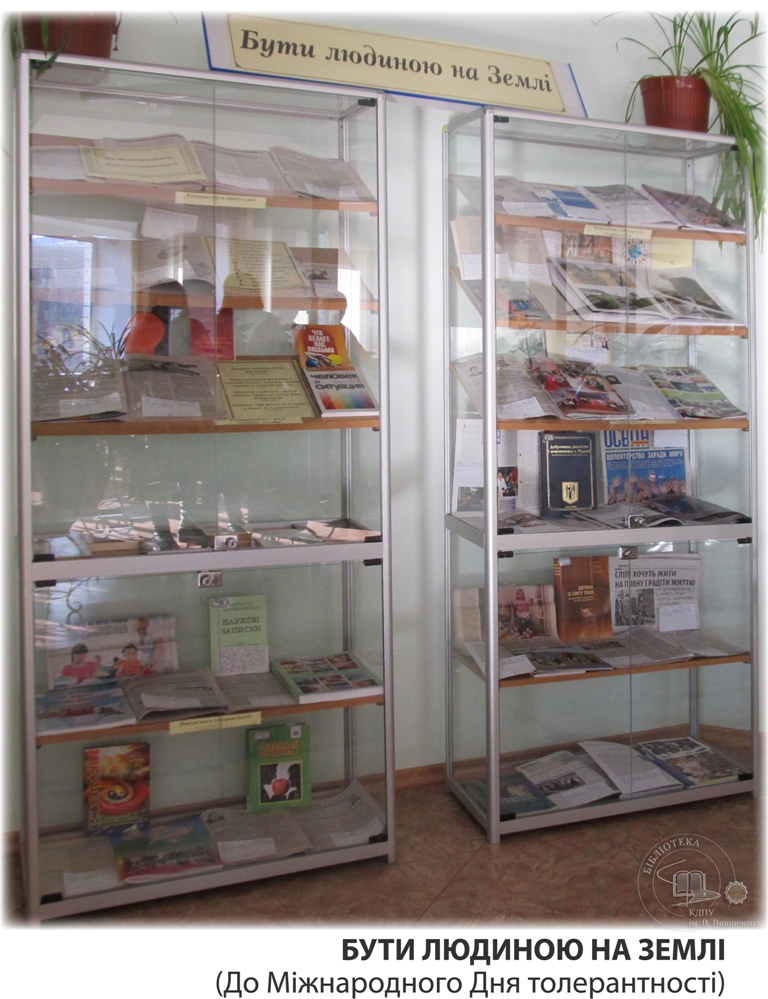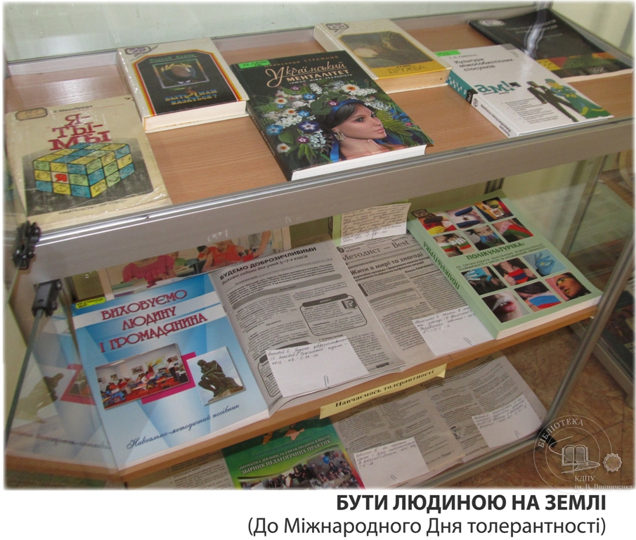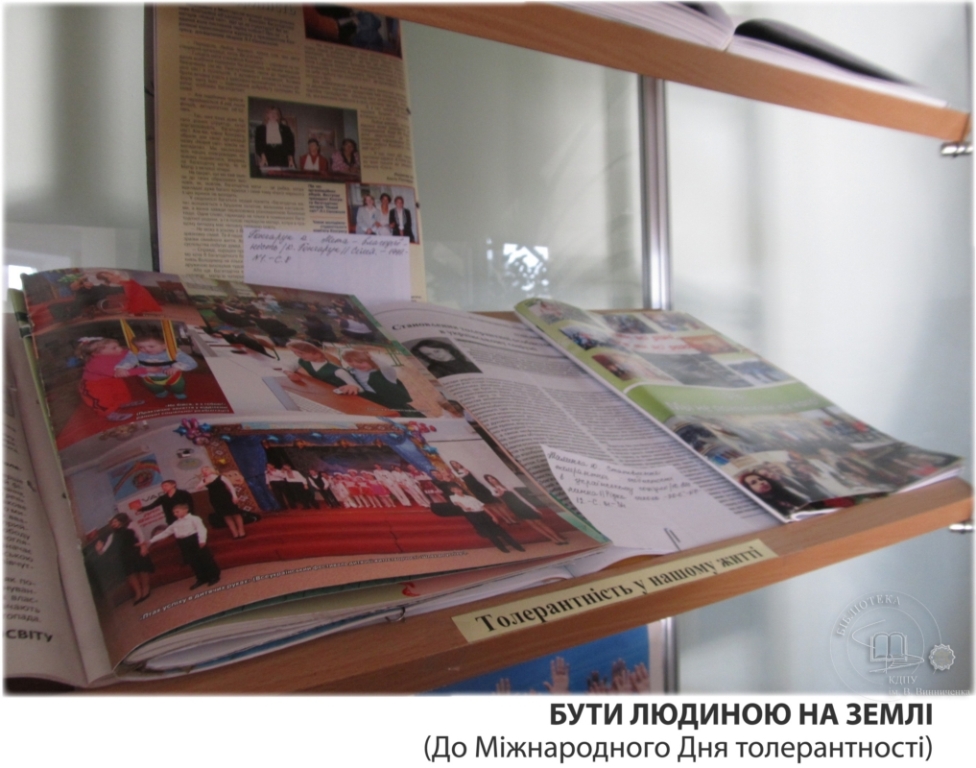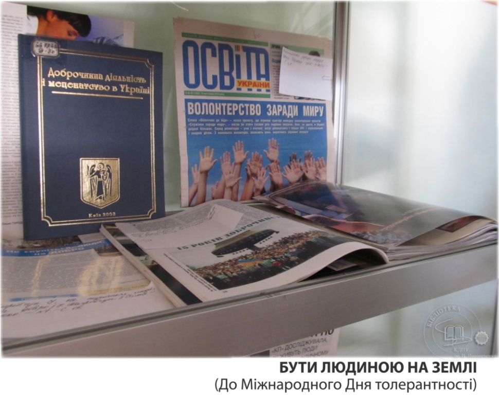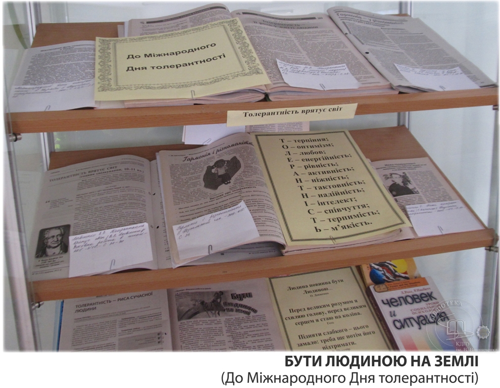 До Міжнародного Дня толерантності, який відзначається 16 листопада, в універсальному читальному залі експонується виставка «Бути людиною на землі». Проблема розвитку духовності, зокрема толерантного ставлення до людини, до свого оточення в наш час стала злободенною. Виставка познайомить читача з історією виникнення цього свята. З представленої літератури можна дізнатись про значення даного поняття, роль толерантності в житті людей, як навчити дитину доброзичливого і поважного ставлення до інших.