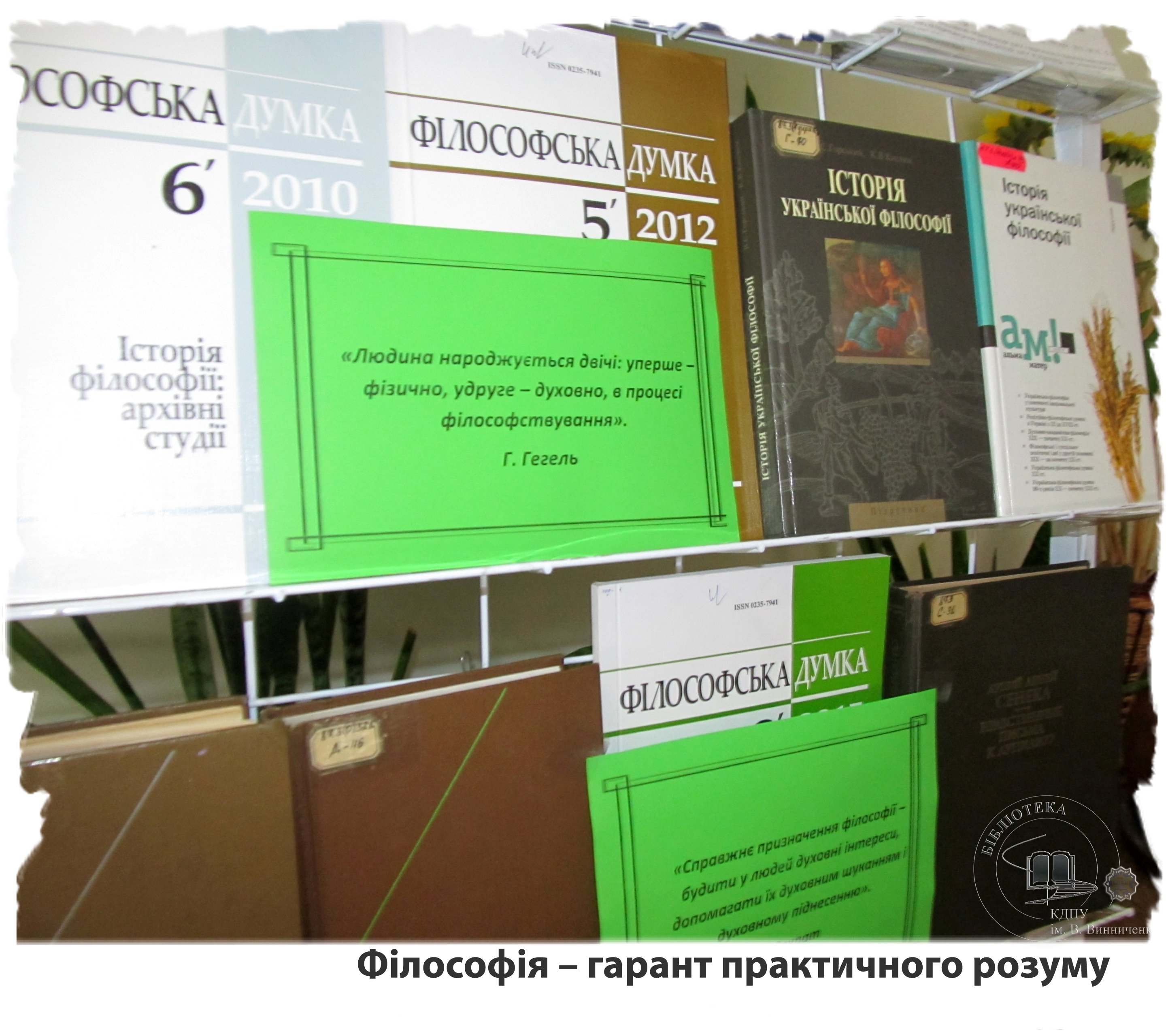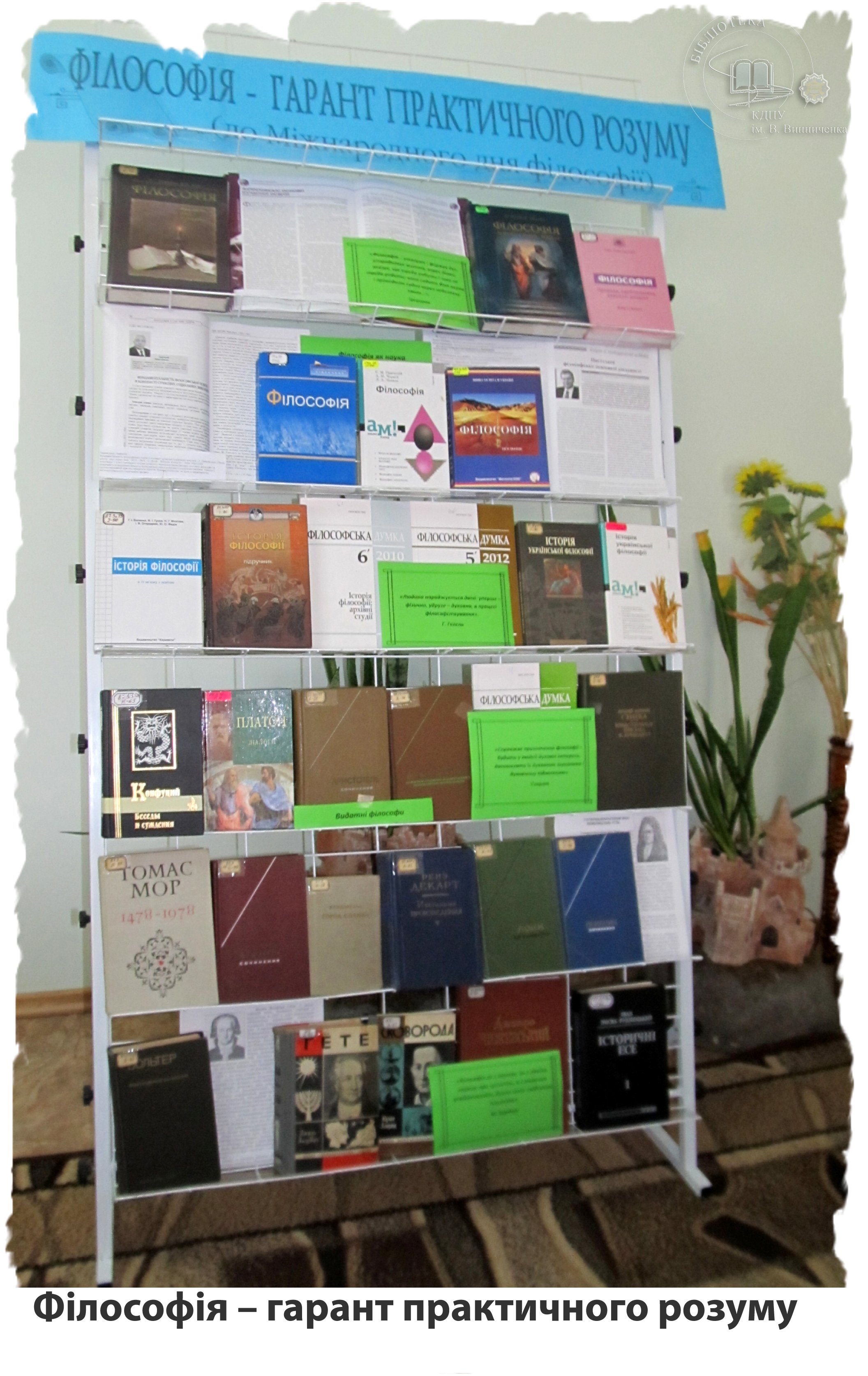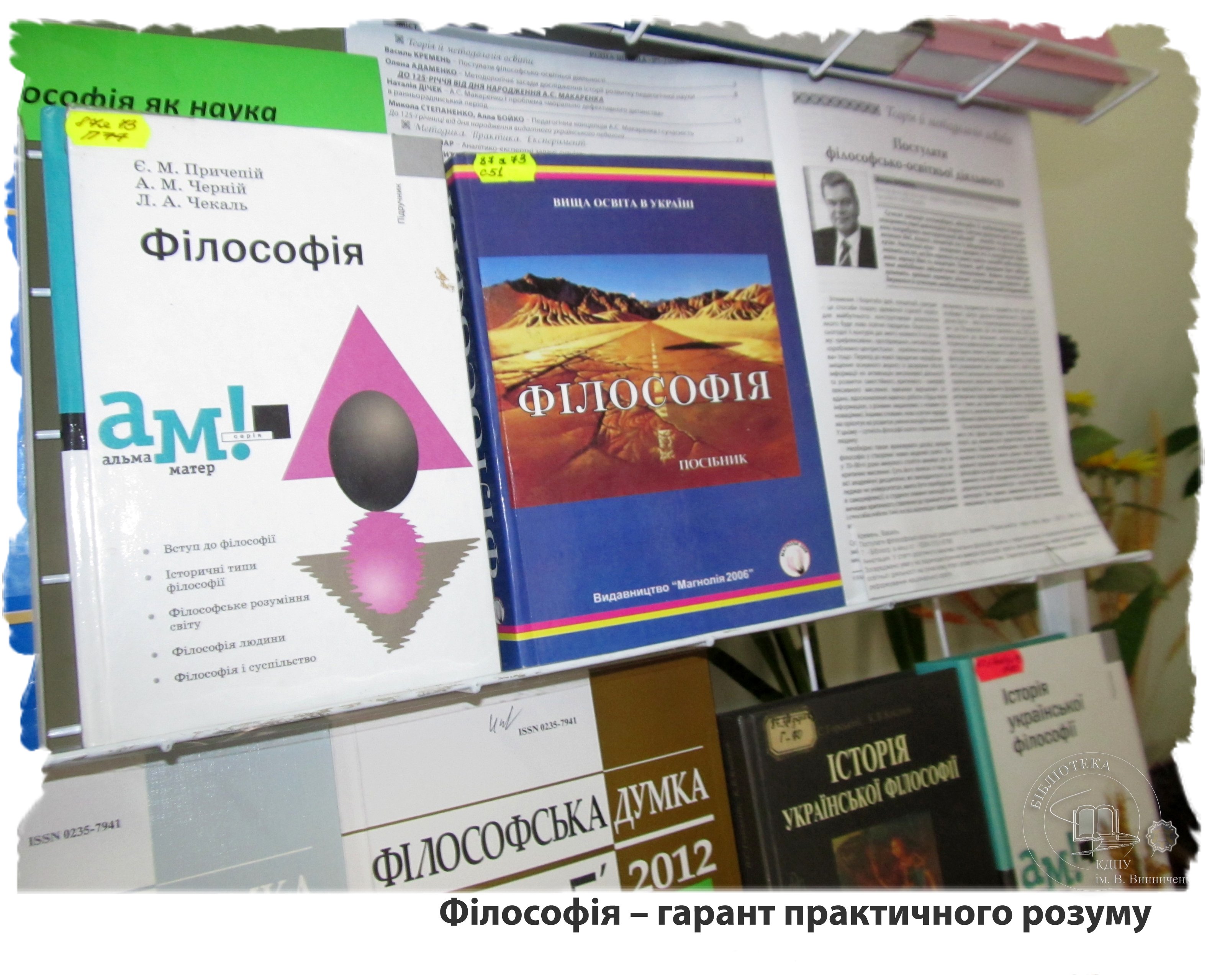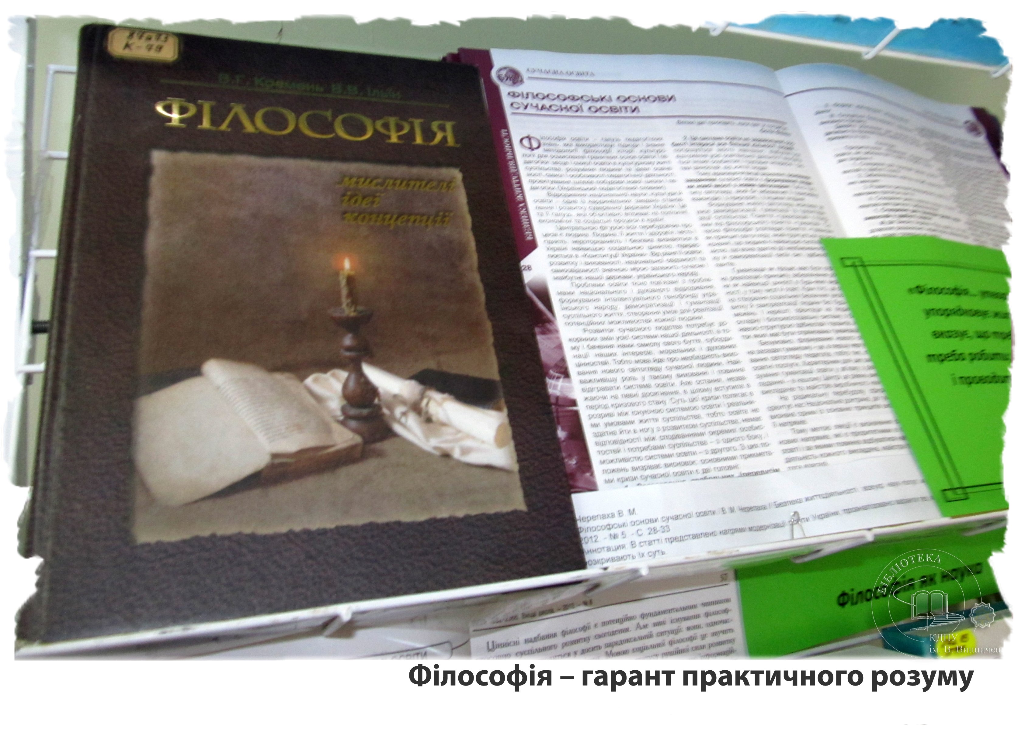 До Міжнародного дня філософа універсальний читальний зал пропонує вашій увазі виставку «Філософія – гарант практичного розуму». Прагнення стати не тільки освіченою, а й сучасною людиною не може здійснитися без вивчення філософії, яка завжди була джерелом віковічних запитань людського духу щодо сенсу життя та смерті, таїни людського існування, розгадки секретів пізнання світу та історії.