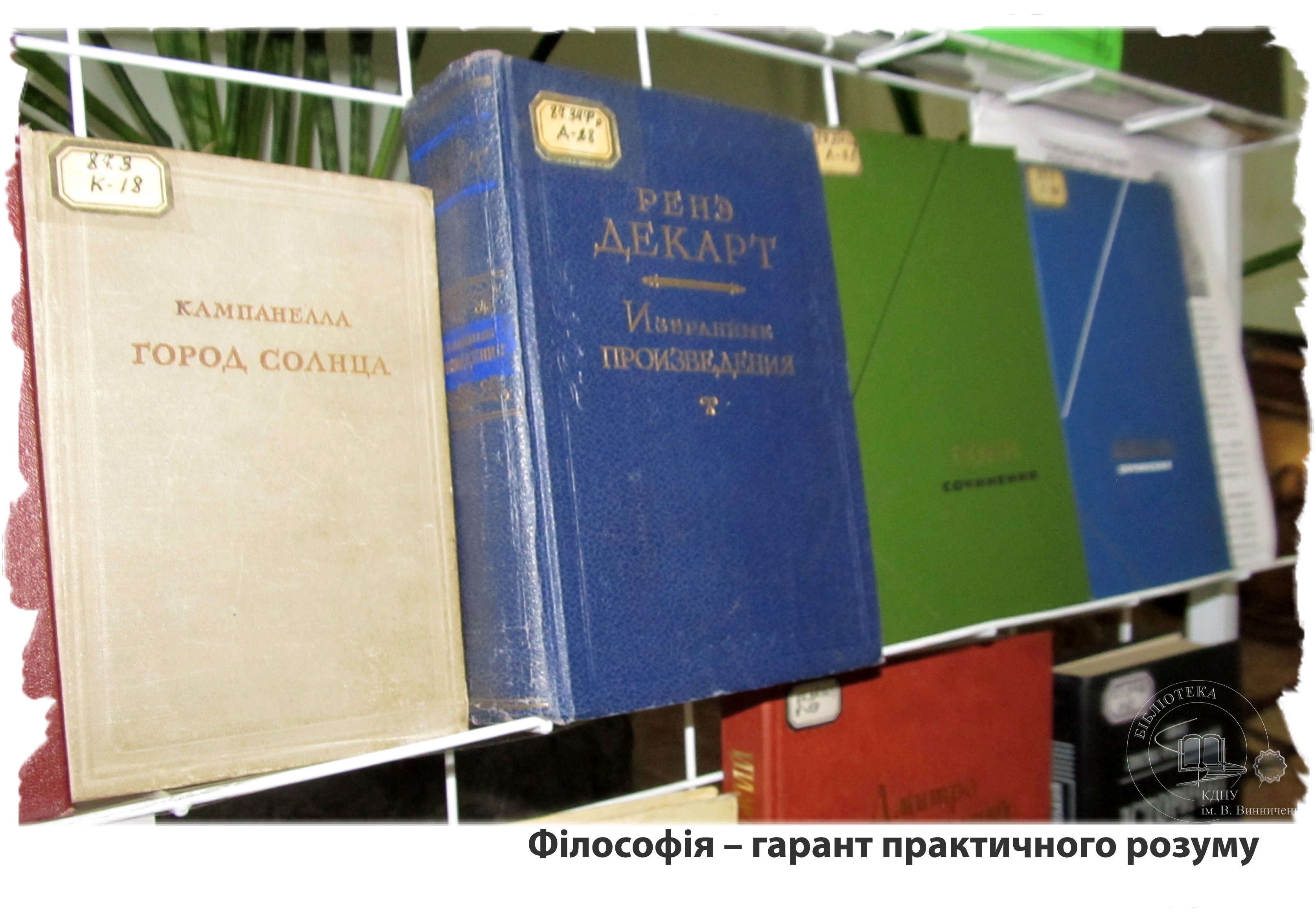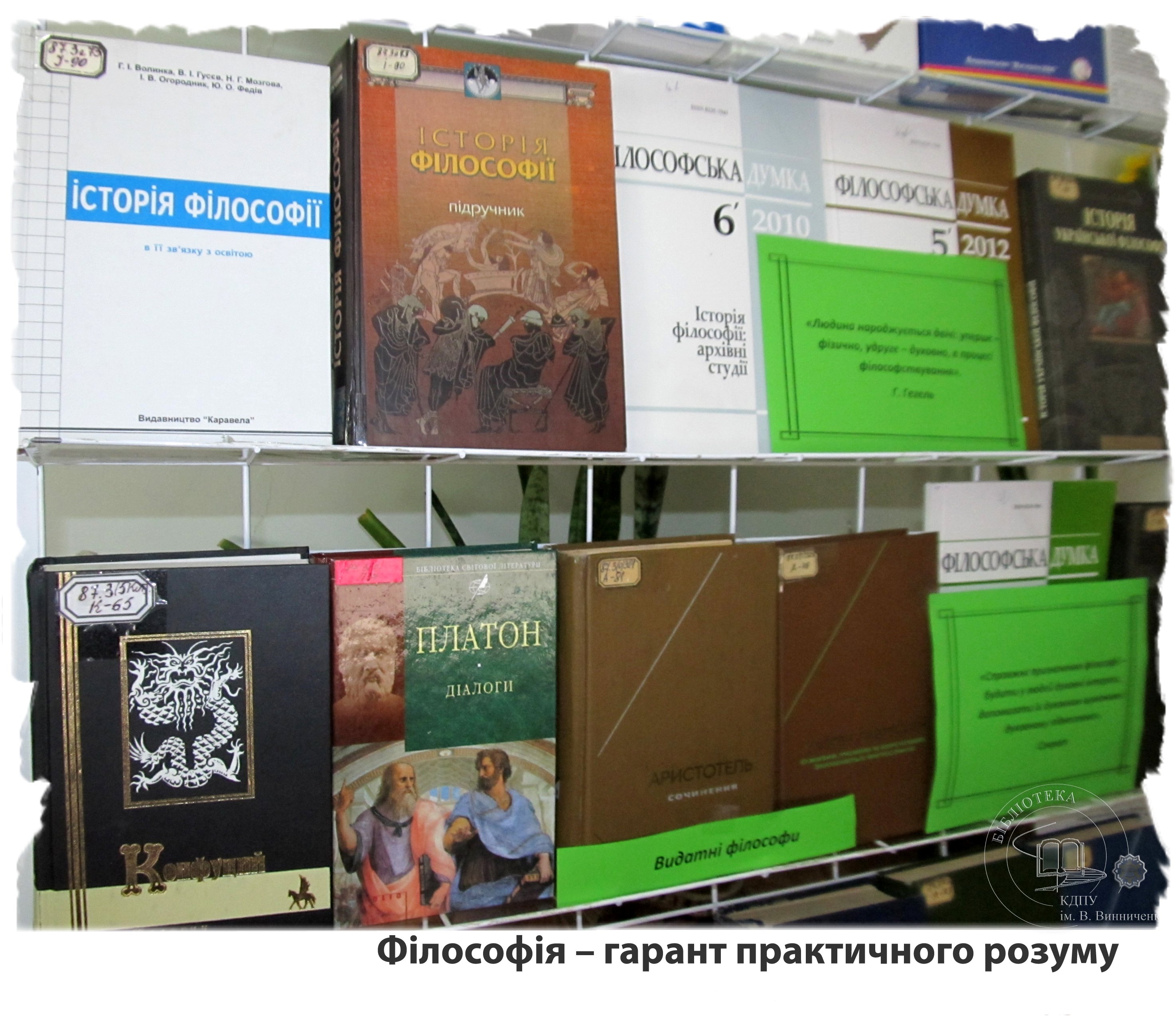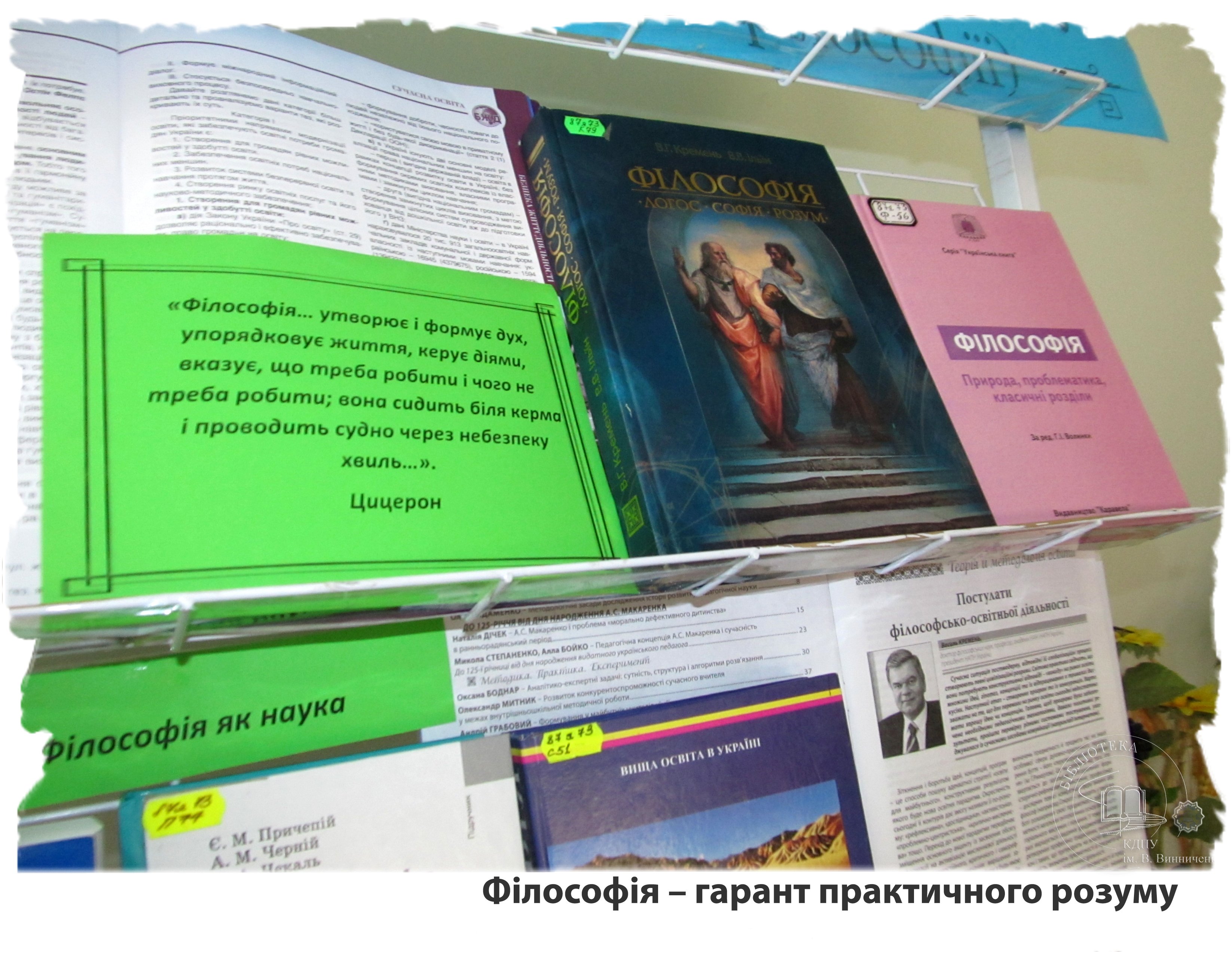 До Міжнародного дня філософа універсальний читальний зал пропонує вашій увазі виставку «Філософія – гарант практичного розуму». Прагнення стати не тільки освіченою, а й сучасною людиною не може здійснитися без вивчення філософії, яка завжди була джерелом віковічних запитань людського духу щодо сенсу життя та смерті, таїни людського існування, розгадки секретів пізнання світу та історії.