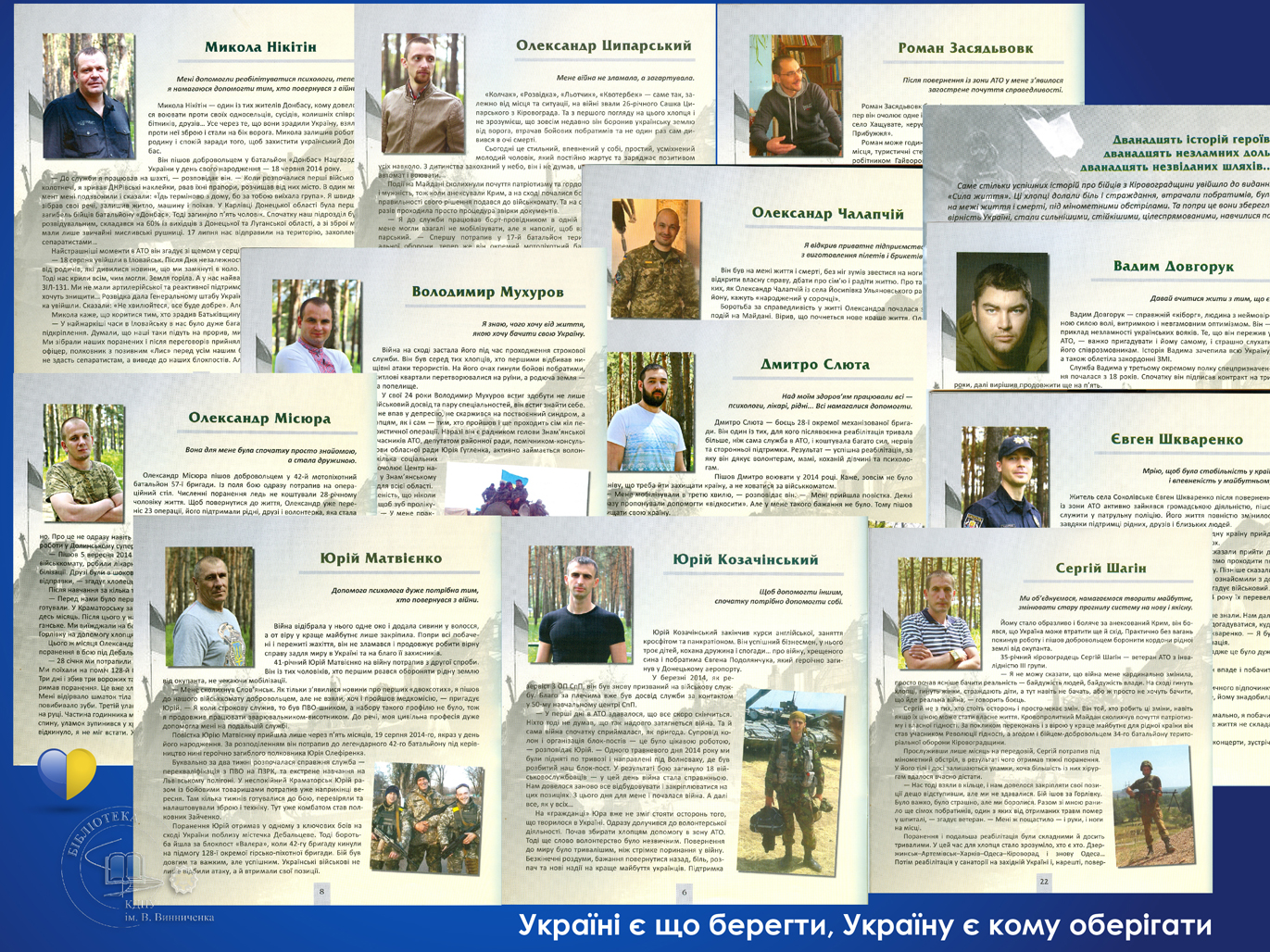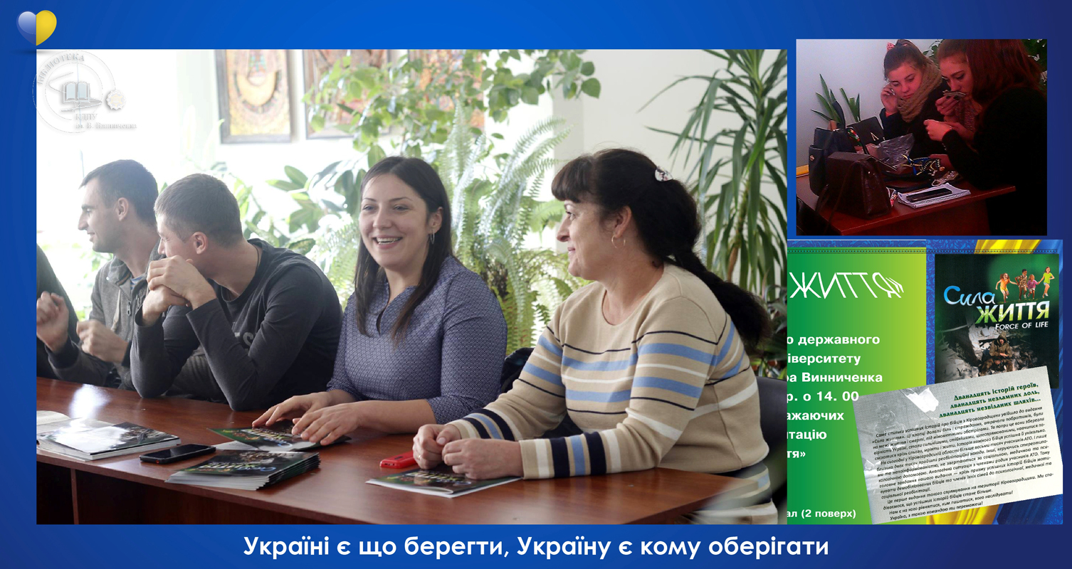 До Дня Захисника України в універсальному читальному залі відбулася зустріч студентів факультету історії та права з авторами видання «Сила життя» та бійцями АТО, історії життя яких увійшли в основу книги. Автори проекту: практикуючий військовий психолог Г. Колєва, колишній атовець В. Мухуров та журналісти: О. Сідорова, В. Семененко, Ж. Петрович охарактеризували суть і завдання видання – допомогти учасникам воєнних дій повернутись до реального буденного життя, здолати фізичні та психологічні негаразди, стати успішними людьми.