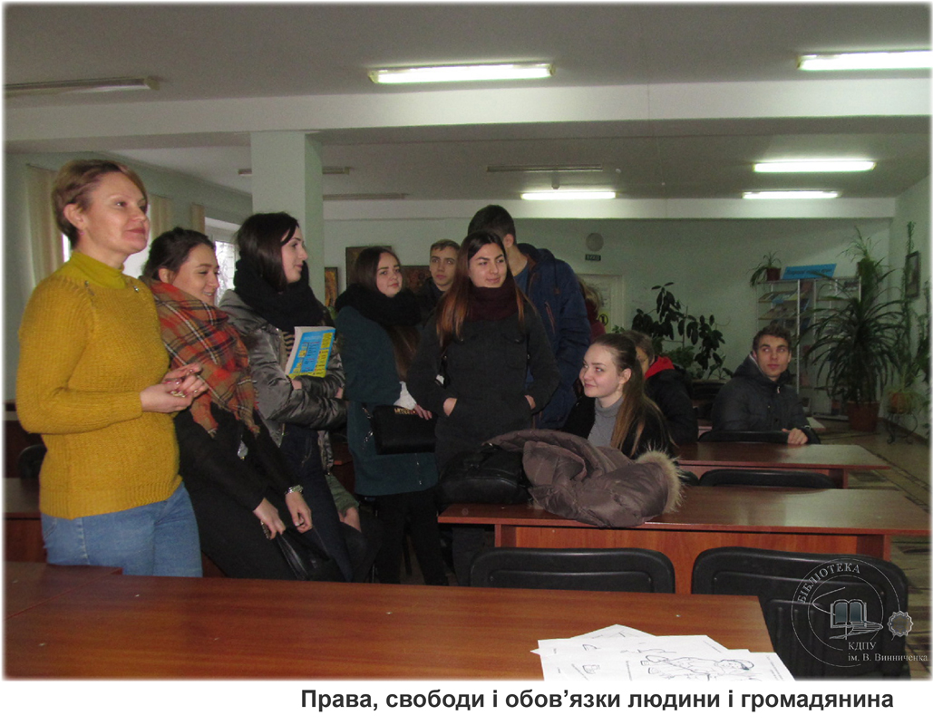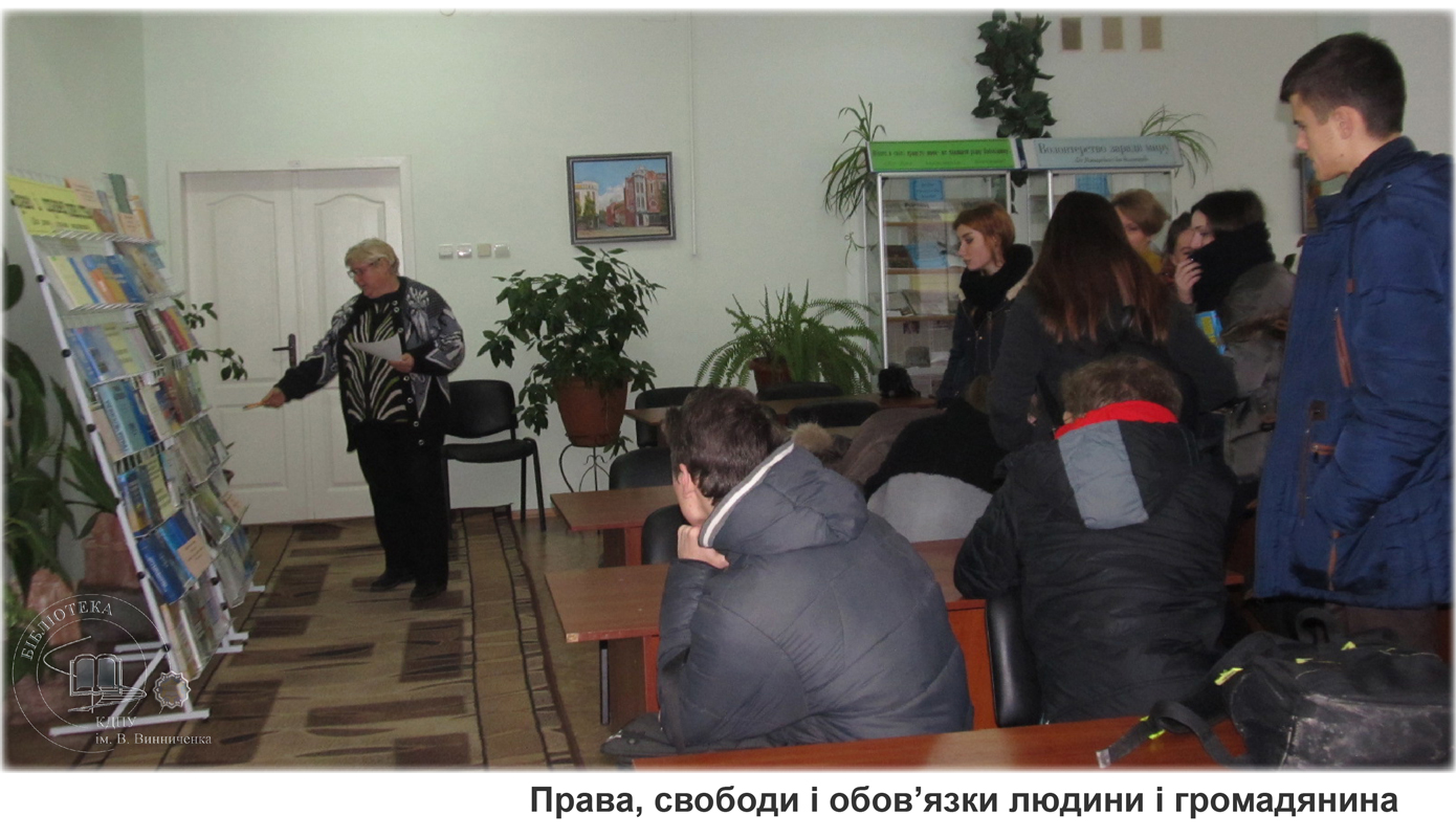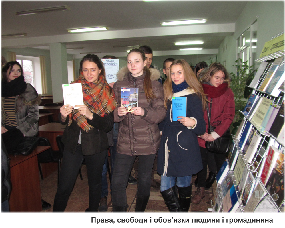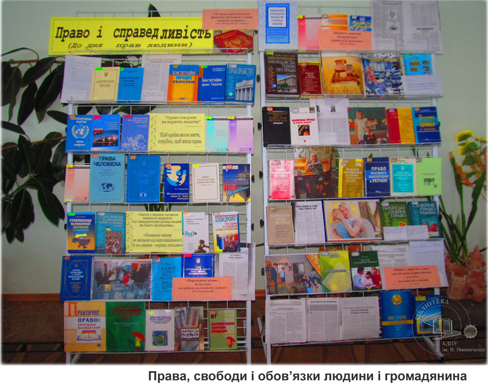 Указом Президента України від 08.12. 2008 року № 1149 започатковано Всеукраїнський тиждень права, що включає 10 грудня – День прав людини, який відзначається в пам’ять проголошення Генеральною Асамблеєю ООН в 1948 році Загальної декларації прав людини. З нагоди цього свята бібліотекарі підготували розгорнуту книжкову виставку «Права і справедливість» та провели огляди виставки для учнів педагогічного ліцею.