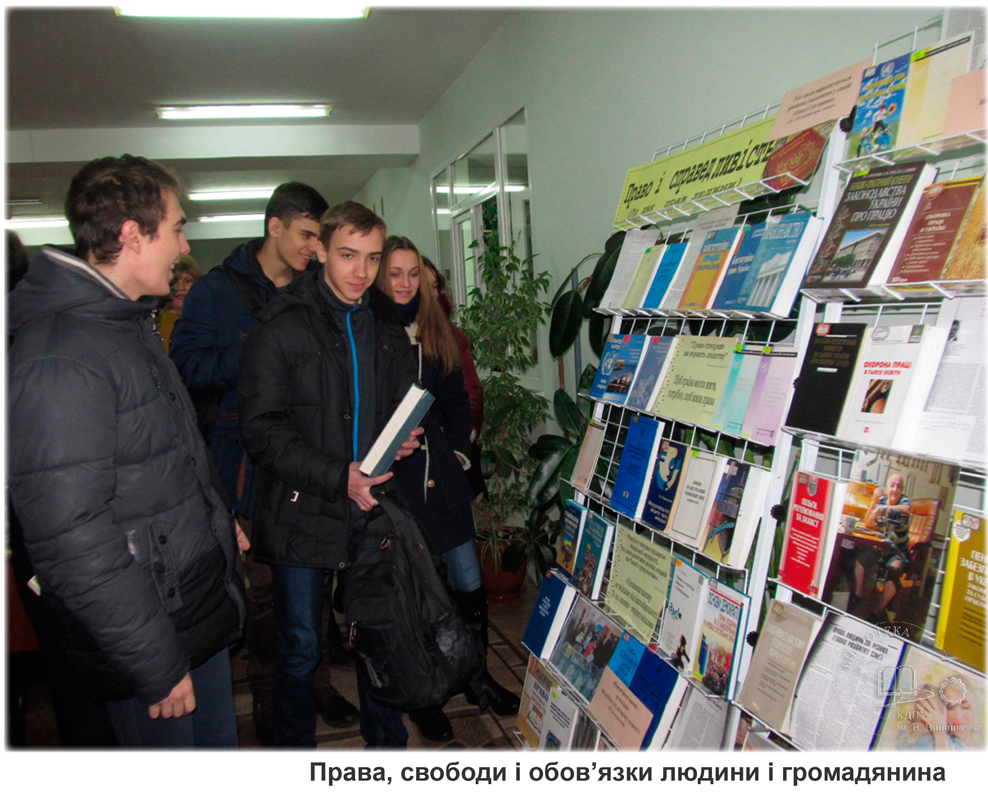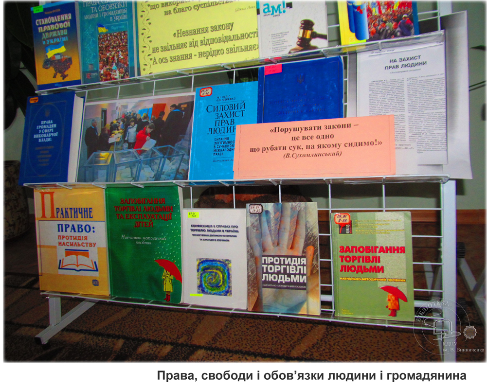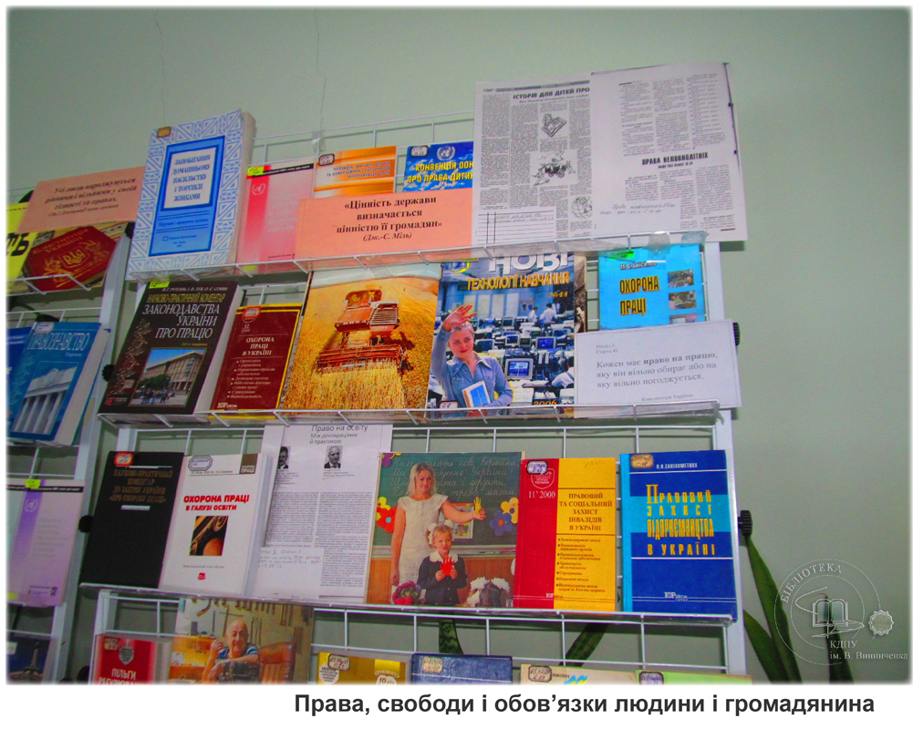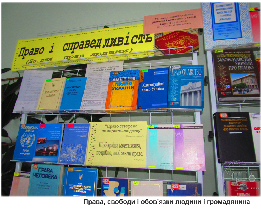 Експозиція висвітлює юридичні книги, які знайомлять з поняттям та загальною характеристикою прав, свобод та обов’язків людини і громадянина.