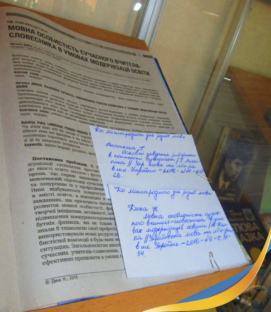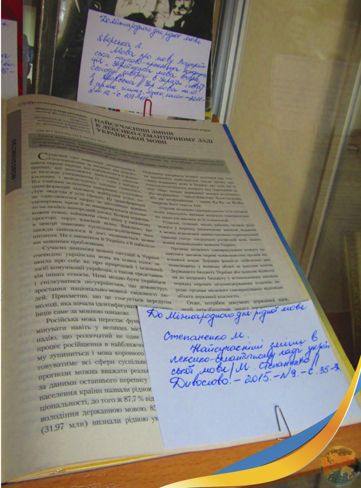 21 лютого відзначається Міжнародний день рідної мови. До цієї дати в читальному залі філологічних дисциплін експонується виставка «Кришталь моєї мови дорогої». Читачам пропонуються наукові дослідження та методичні розробки з питань сучасного мовного процесу. Сторінки матеріалів виставки висвітлюють запит українського суспільства до вивчення рідної мови. На виставку запрошуються викладачі, аспіранти, студенти та всі, кому не байдужа доля рідної мови.