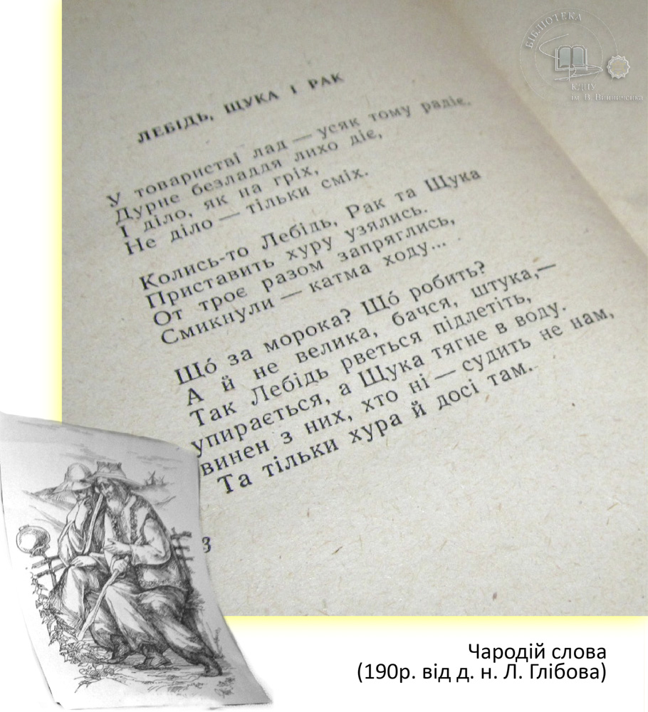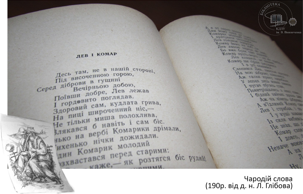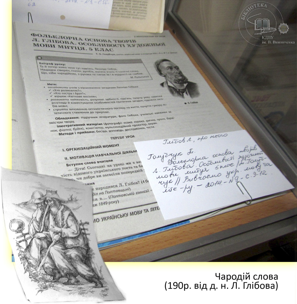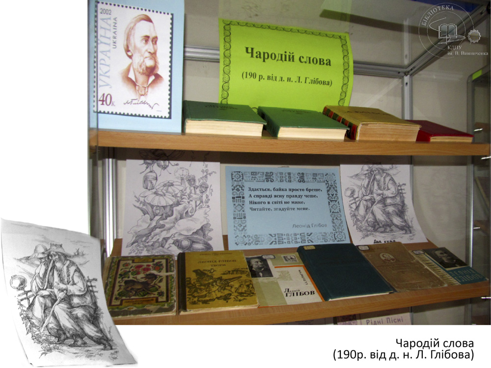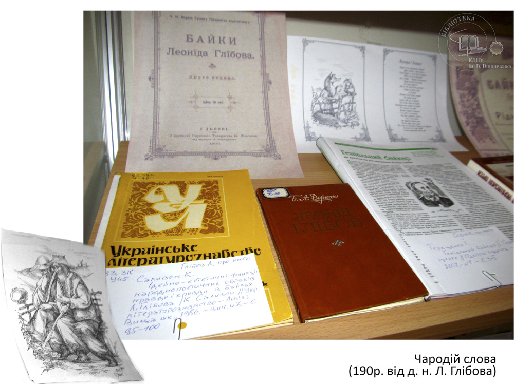 В літературі кожного народу є письменники, які уособлюють певний жанр. Такою постаттю в українській літературі, безперечно, є Леонід Глібов, справжнім поетичним покликанням якого була байка. До 190 річниці від д. н. видатного байкаря в читальному залі філологічних дисциплін експонується виставка «Чародій слова». Допитливий читач, завітавши на виставку, має змогу поглибити свої знання про байкарську спадщину Глібова, розкрити алегоричний і повчальний зміст байок.