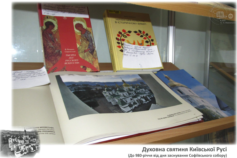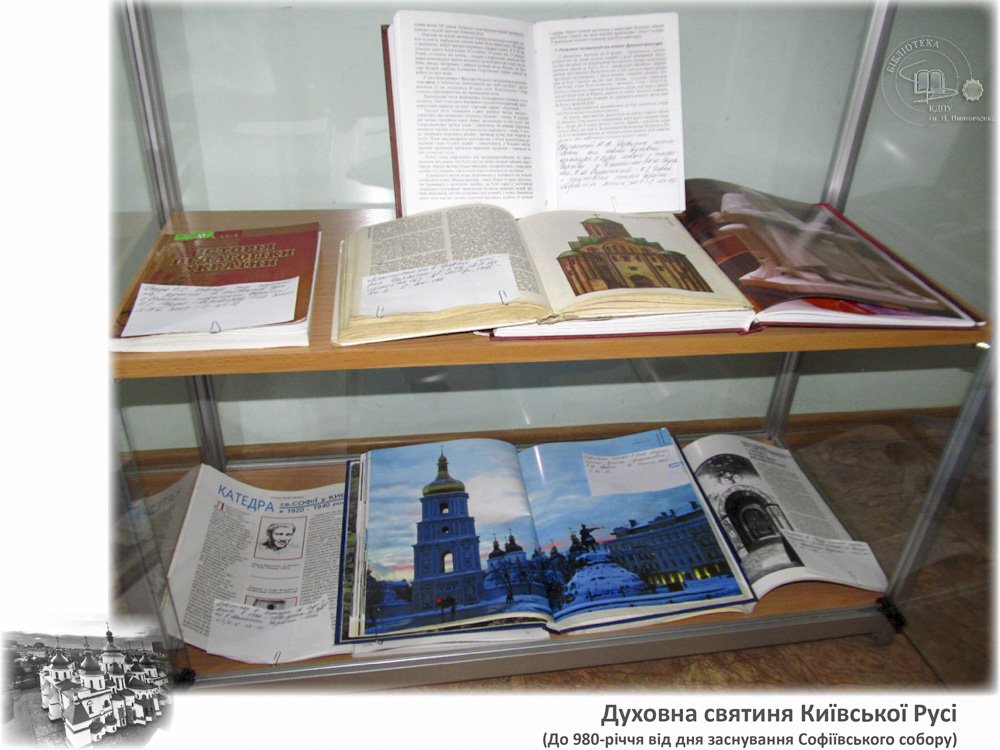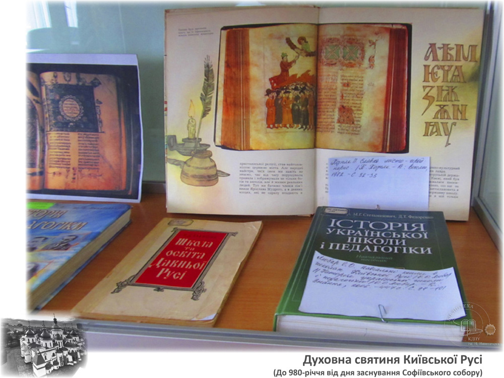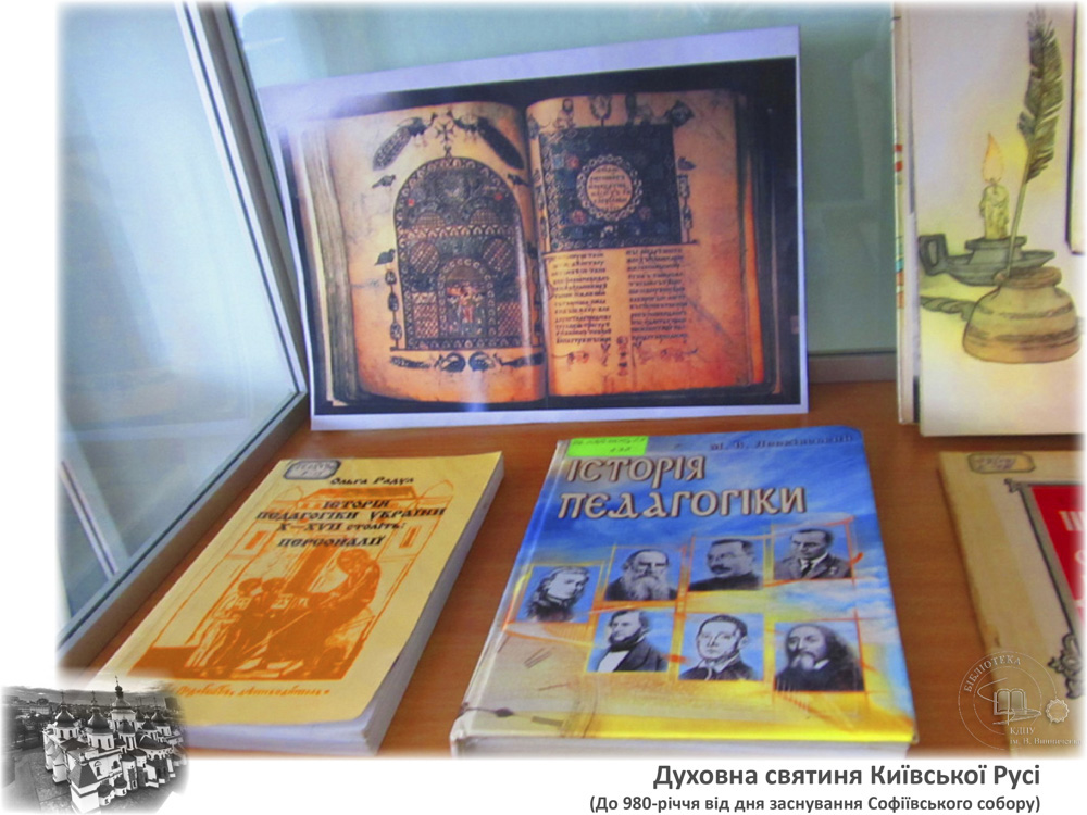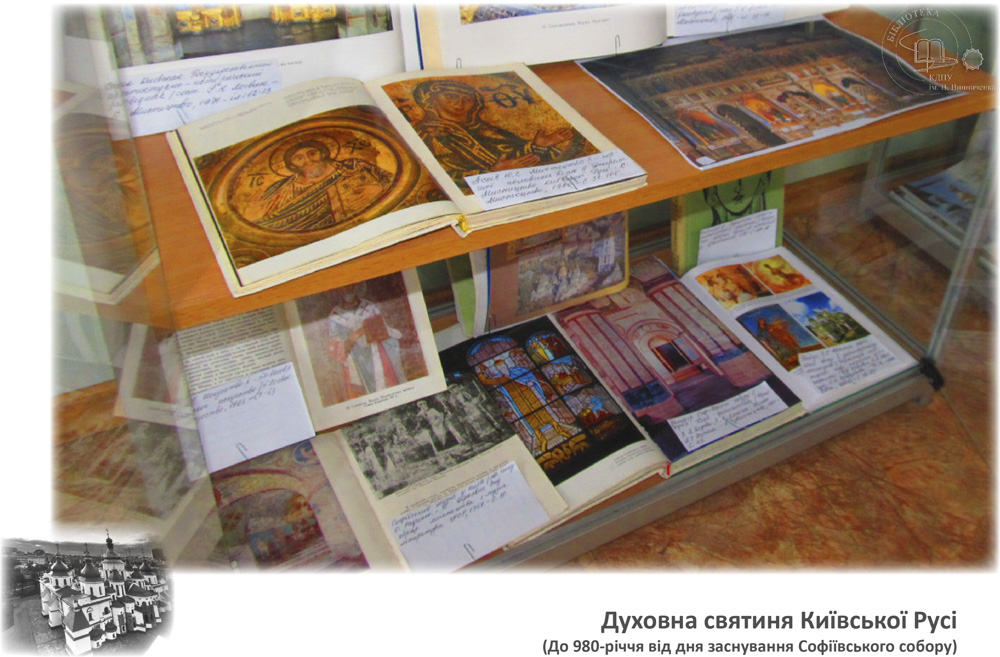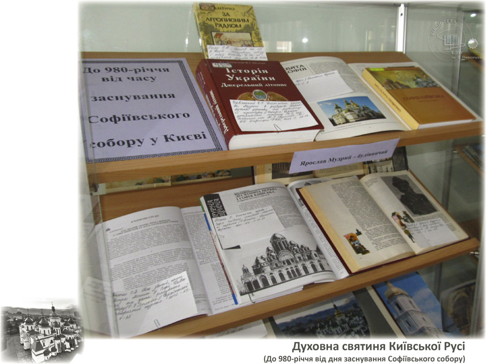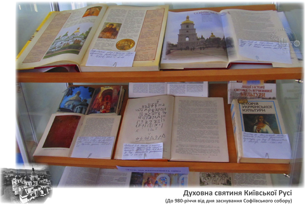 Київ...Він був столицею Київської Русі і продовжує свою історію, як столиця незалежної України. За своє 1535- річне існування, місто втратило багато пам’ятників архітектури і культури та, на щастя, до наших днів зберігся Софіївський собор – одна з найвидатніших споруд Княжої доби. Споруджений у 1037 році на місці перемоги над печенігами, він був задуманий, як головний християнський храм Давньої Русі. У 2017 році виповнюється 980 років від часу спорудження собору і заснування при ньому Ярославом Мудрим першої бібліотеки. Бібліотекарі підготували цікаву і яскраву виставку до цього ювілею під назвою «Духовна святиня Київської Русі».