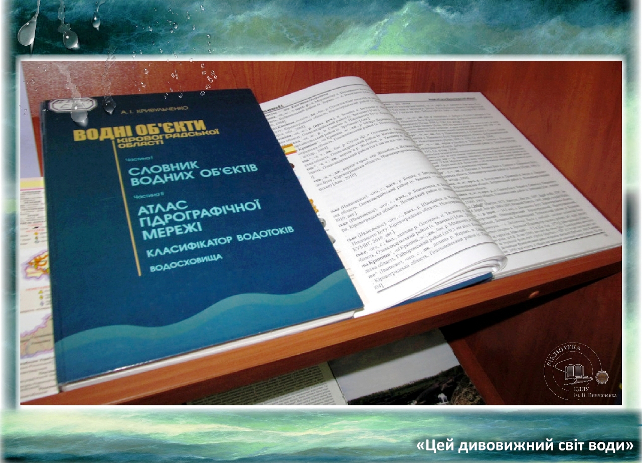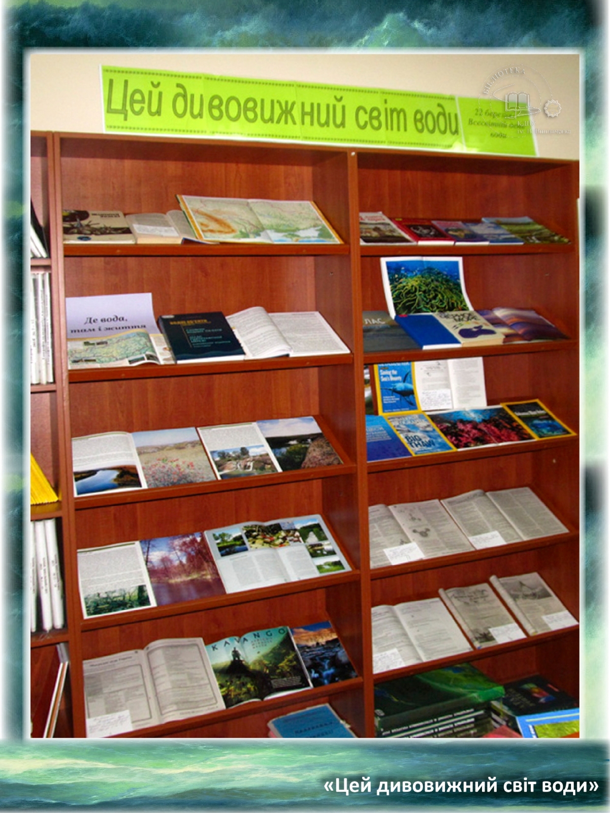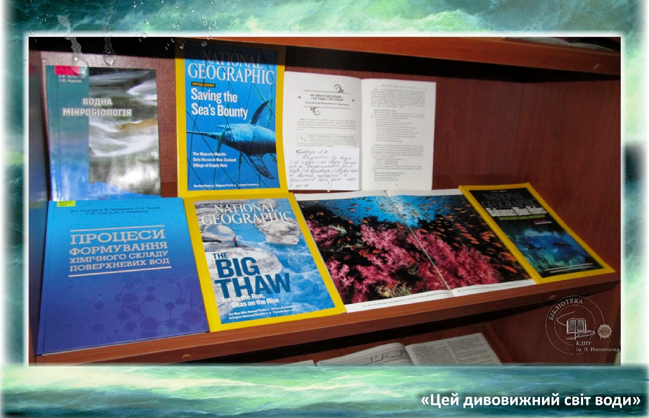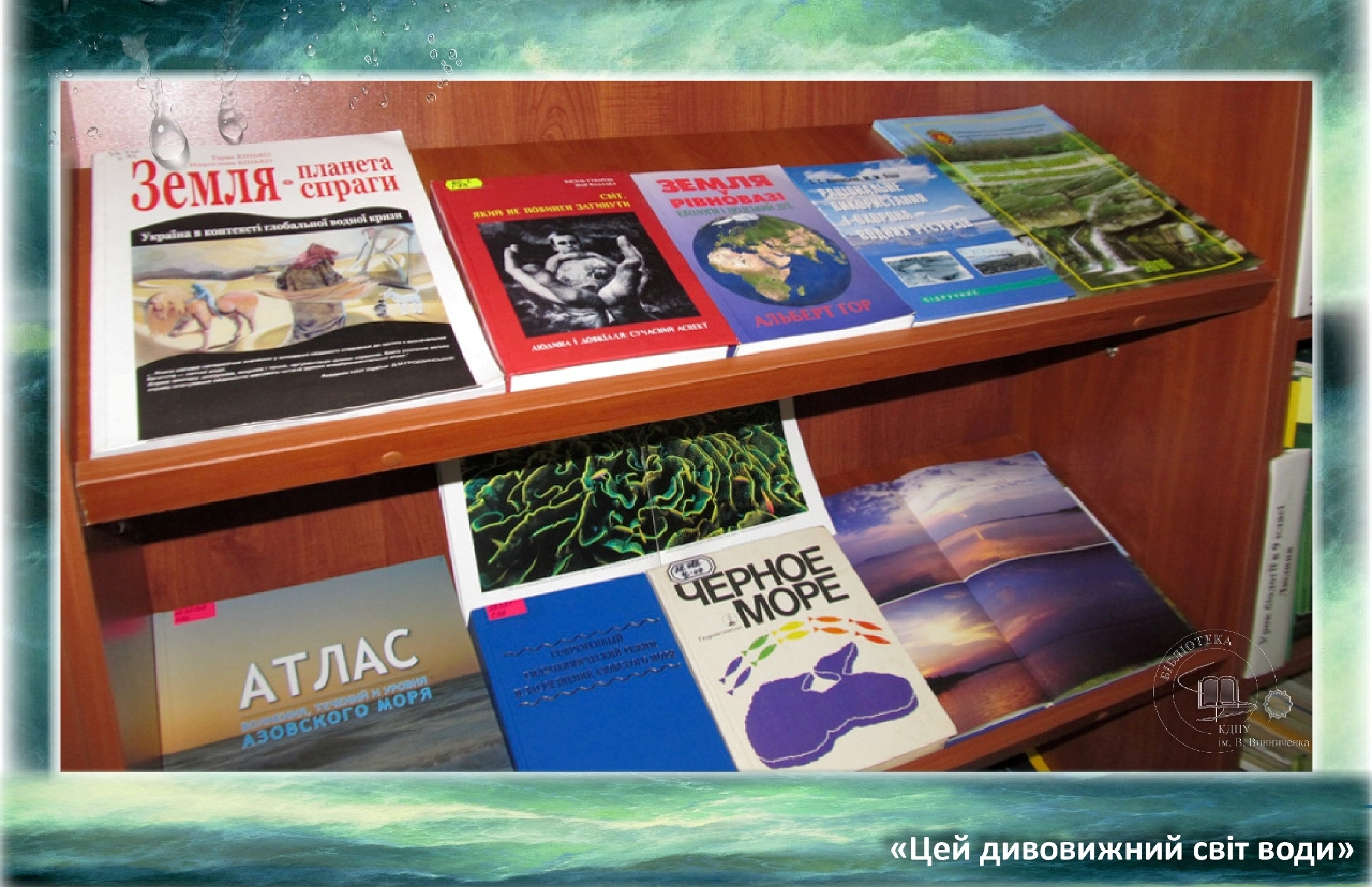 З книг, представлених на виставці, читач почерпне для себе різноманітну інформацію про надмірне споживання, забруднення і зменшення планетарних запасів прісної води, про походження і значення води, про екологічні, економічні, політичні, демографічні проблеми, породжені глобальною водною кризою, про загальний стан водоспоживання, водокористування й водного забезпечення в Україні.