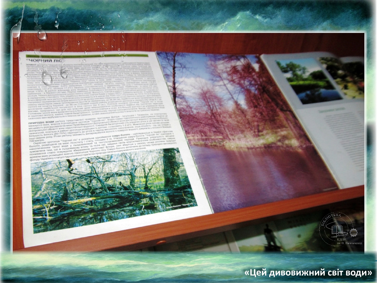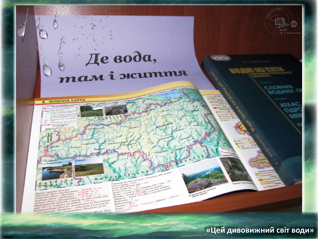 Запрошуємо всіх бажаючих до перегляду виставки. У читальному залі бібліотеки природничо-географічного факультету до Всесвітнього дня води (22 березня) увазі читачів представлена виставка «Цей дивовижний світ води». Вода - найбільше багатство світу, вона необхідна для життя і є самим життям. Проблема води належить до найголовніших соціальних і науково - технічних проблем сучасності.