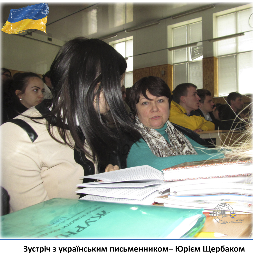20 квітня у педагогічному університеті ім. В. Винниченка відбулася зустріч з відомим українським письменником, лікарем, дипломатом – Юрієм Щербаком. З цієї нагоди бібліотекарі читального залу філологічних дисциплін підготували виставку «Юрій Щербак – воїн світла в українській літературі». Викладачі, студенти та гості мали змогу глибше познайомитися з творчістю автора та переглянути літературно-критичні дослідження та статті.