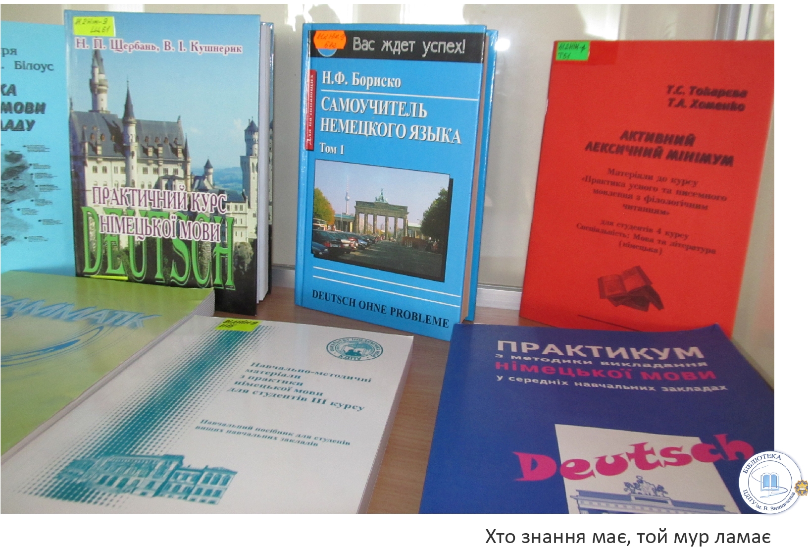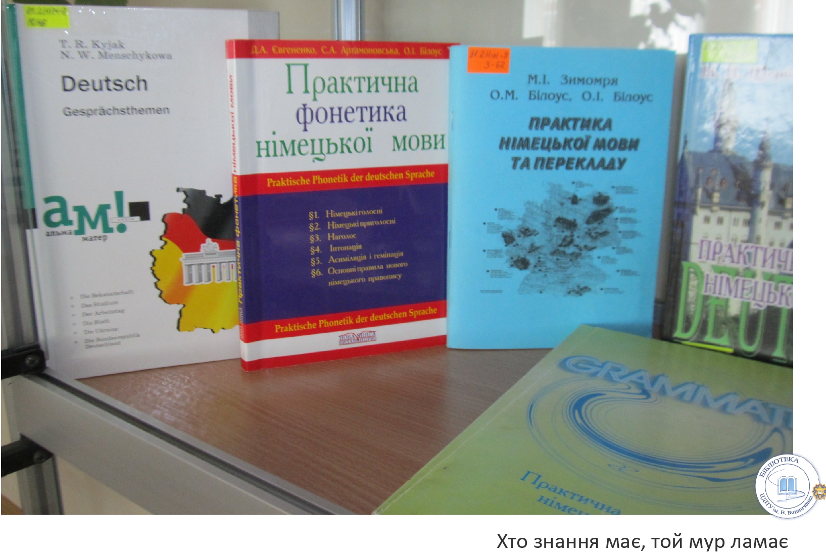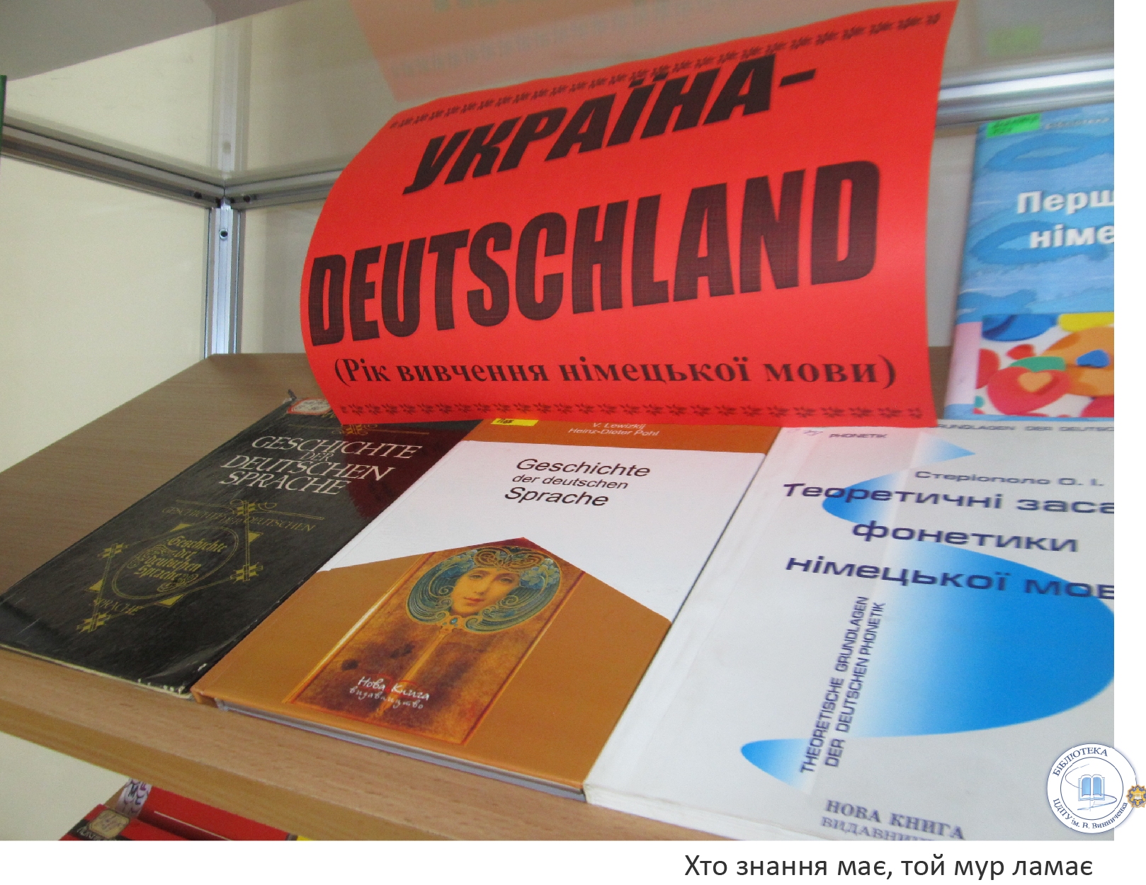 В рамках проведення Року вивчення німецької мови в Україні з 1 вересня до Дня знань в читальному залі філологічних дисциплін розгорнута тематична книжкова виставка «Україна – Deutschland».