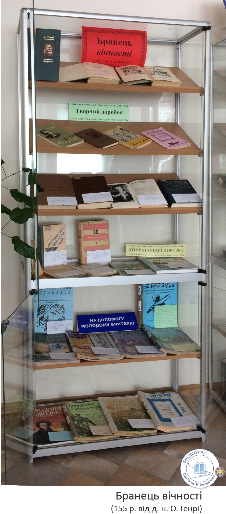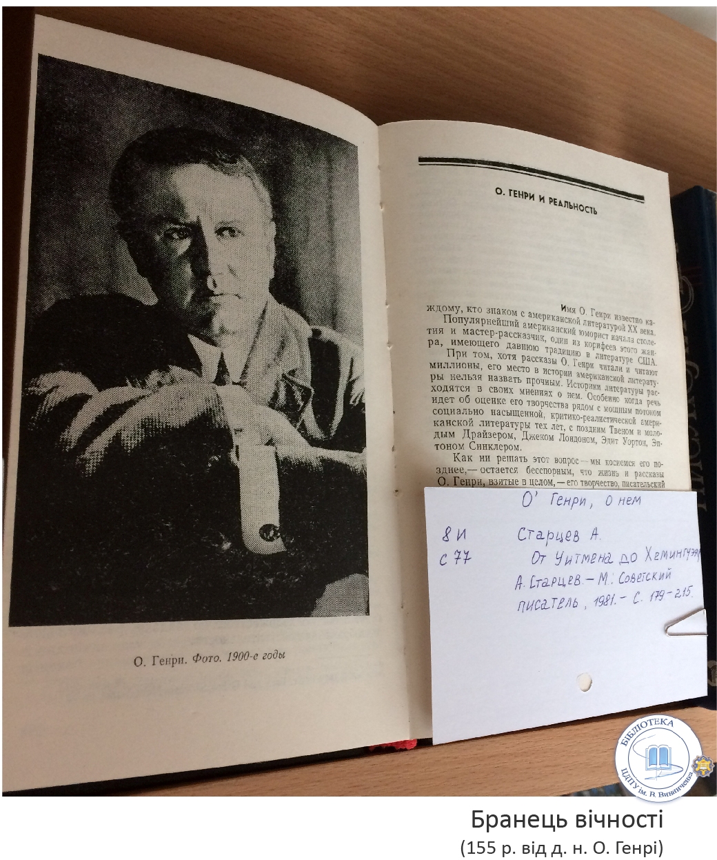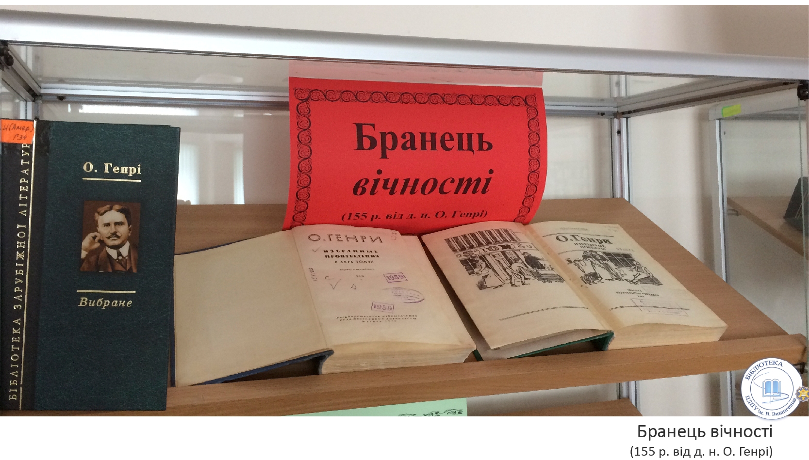 Читачі, які вміють щиро співчувати літературному героєві і радіти за нього, з 7 вересня запрошуються на книжкову виставку "Бранець вічності" до читального залу філологічних дисциплін. Експозиція присвячена людині складної і тяжкої долі. Літературно-критичні матеріали виставки розкривають виразний образ Вільяма Сідні Портера – аптекаря, ковбоя, авантюриста, арештанта, журналіста, який став славетним американським письменником О. Генрі. Художній доробок письменника, який пропонується до уваги користувачів, є прикладом блискучого володіння жанром короткого оповідання. Це завжди комічний бурлеск, маленька петарда, яка розриває соціально-побутові й психологічні штампи. Знайомство з творами майстра новели формує в свідомості читачів розуміння примх життєвої марноти і віру в непохитність вічних загальнолюдських цінностей – добра, краси, любові.
