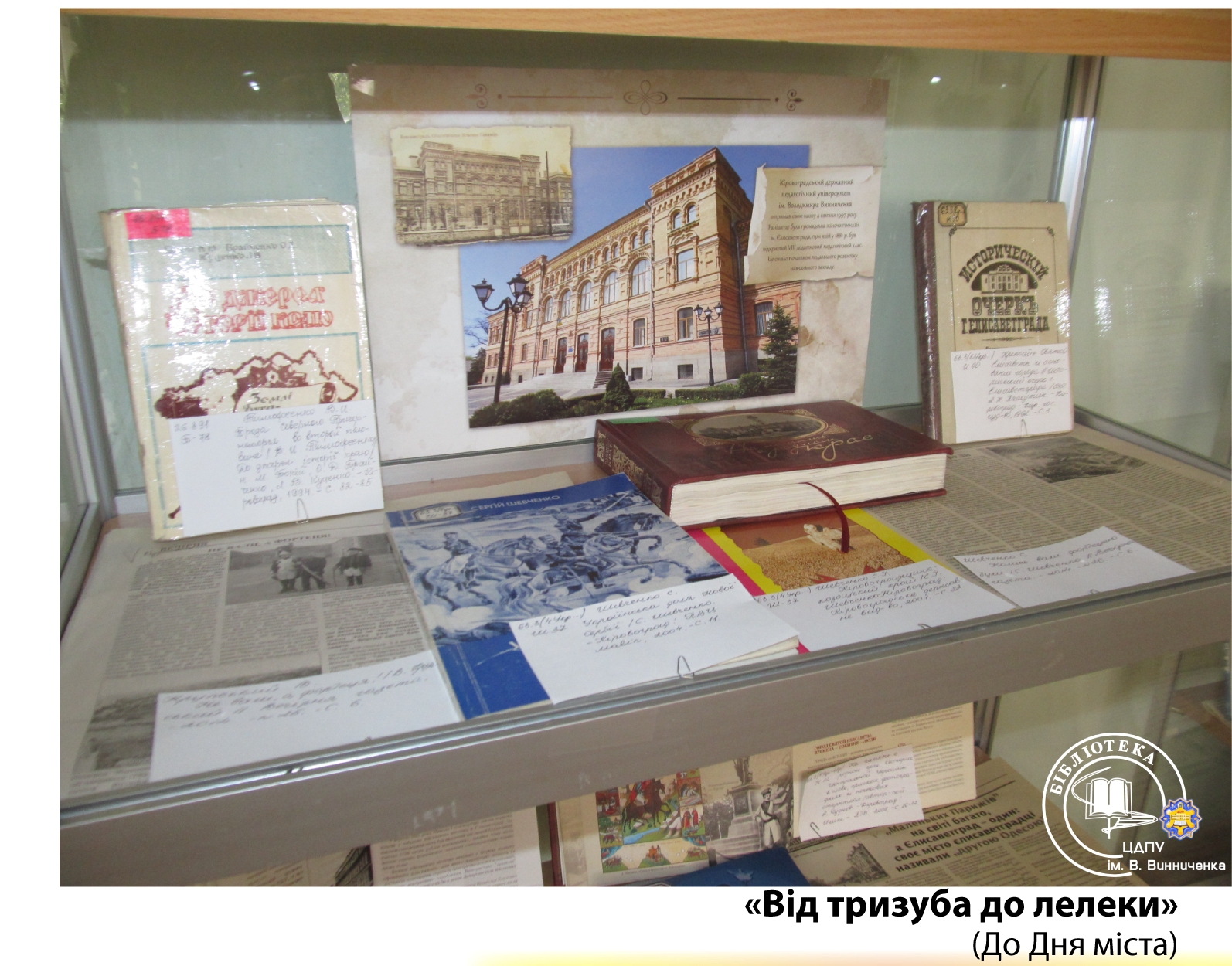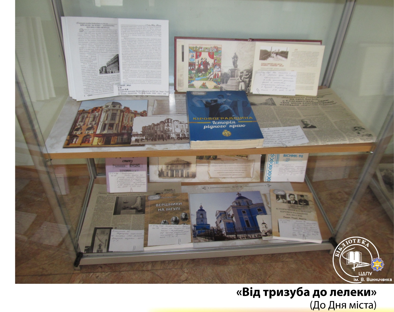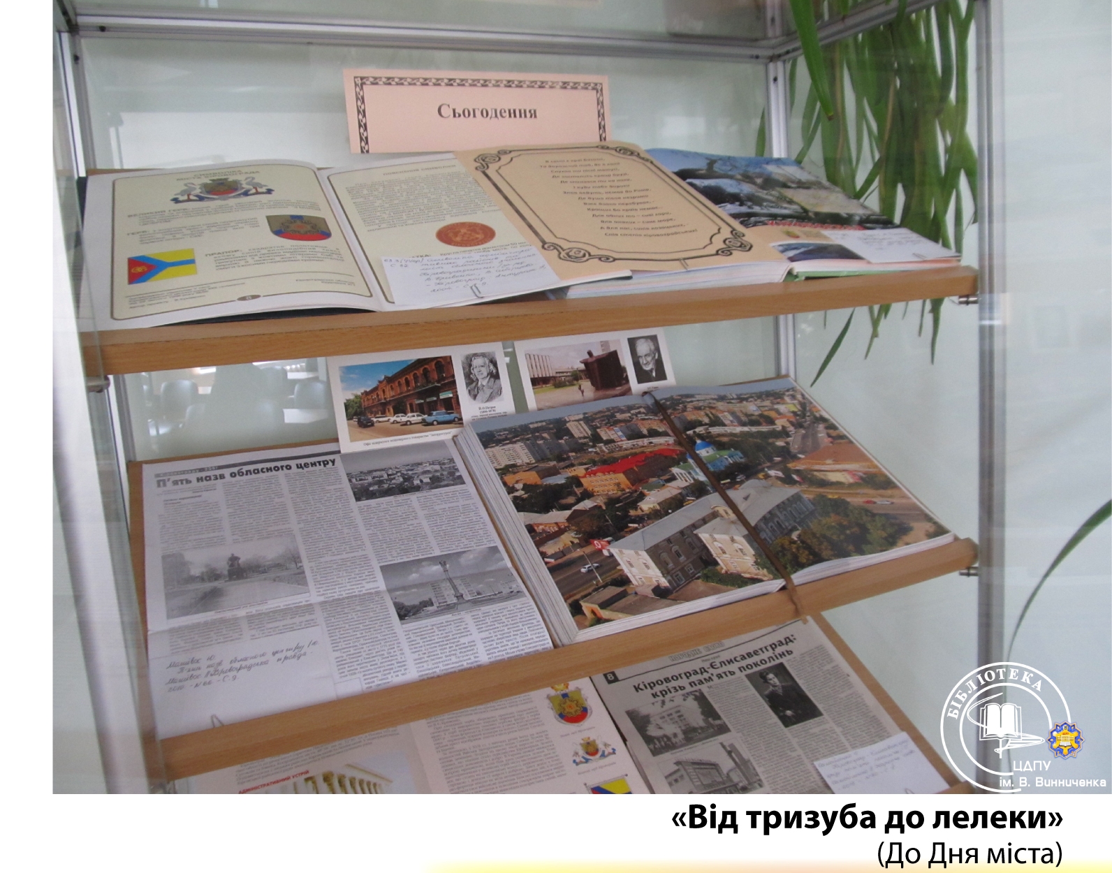 До Дня міста універсальний читальний зал підготував виставку «Від тризуба до лелеки». В матеріалах експозиції ми намагалися представити всі принади нашої малої Батьківщини. У міста над сивим Інгулом складна, надто заплутана історія, особливо в ранній стадії розвитку. Попри це, наше місто дало дуже багато видатних особистостей, як в науці, так і в мистецтві. В нашому рідному домі багато тінистих вулиць, прикрашених чудовими історичними архітектурними спорудами. Парки обласного центру майорять розмаїттям кольорів і буйною зеленню. Затишні кав’ярні припрошують на філіжанку духмяної кави. Завітайте до універсального читального залу для ознайомлення з виставкою.