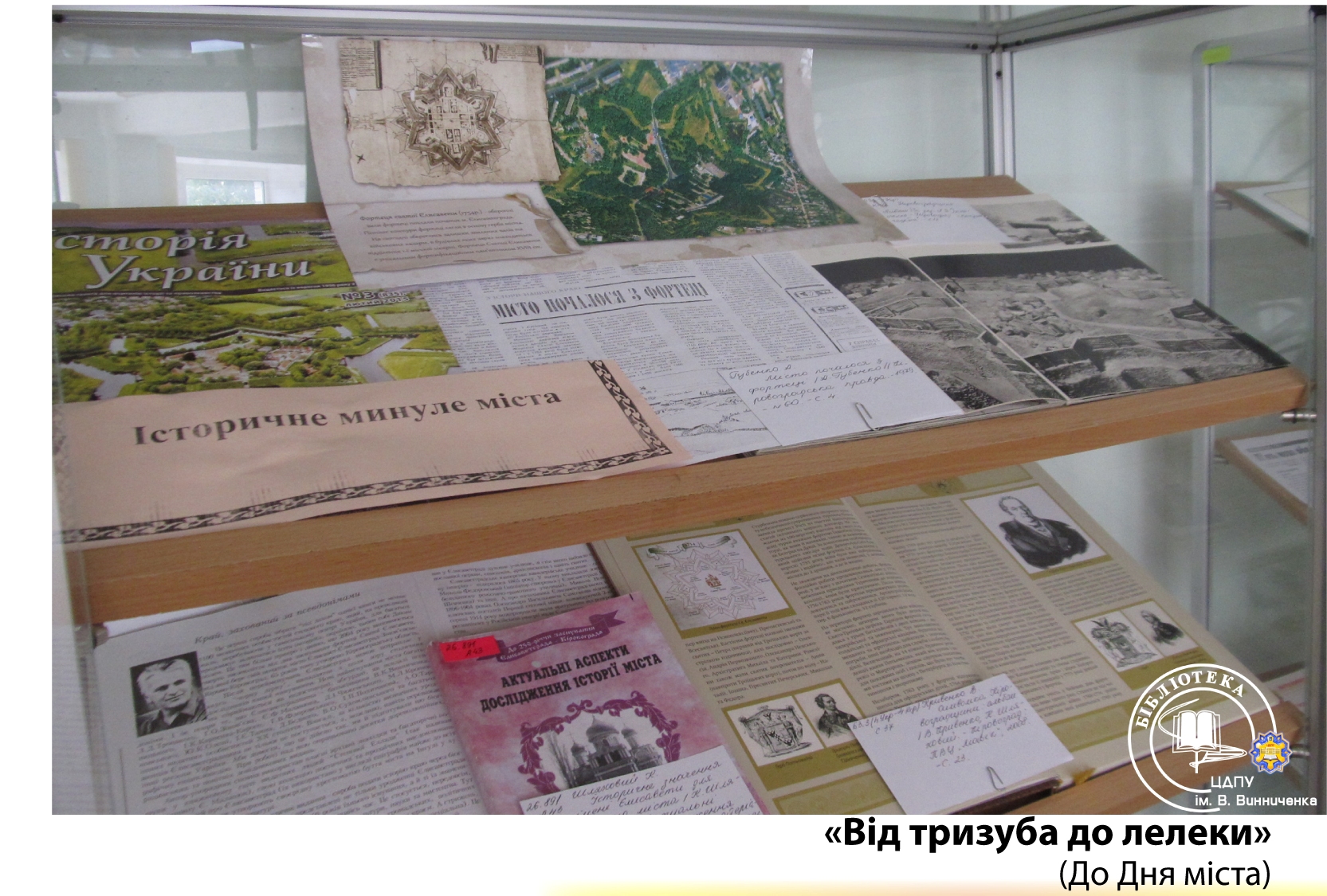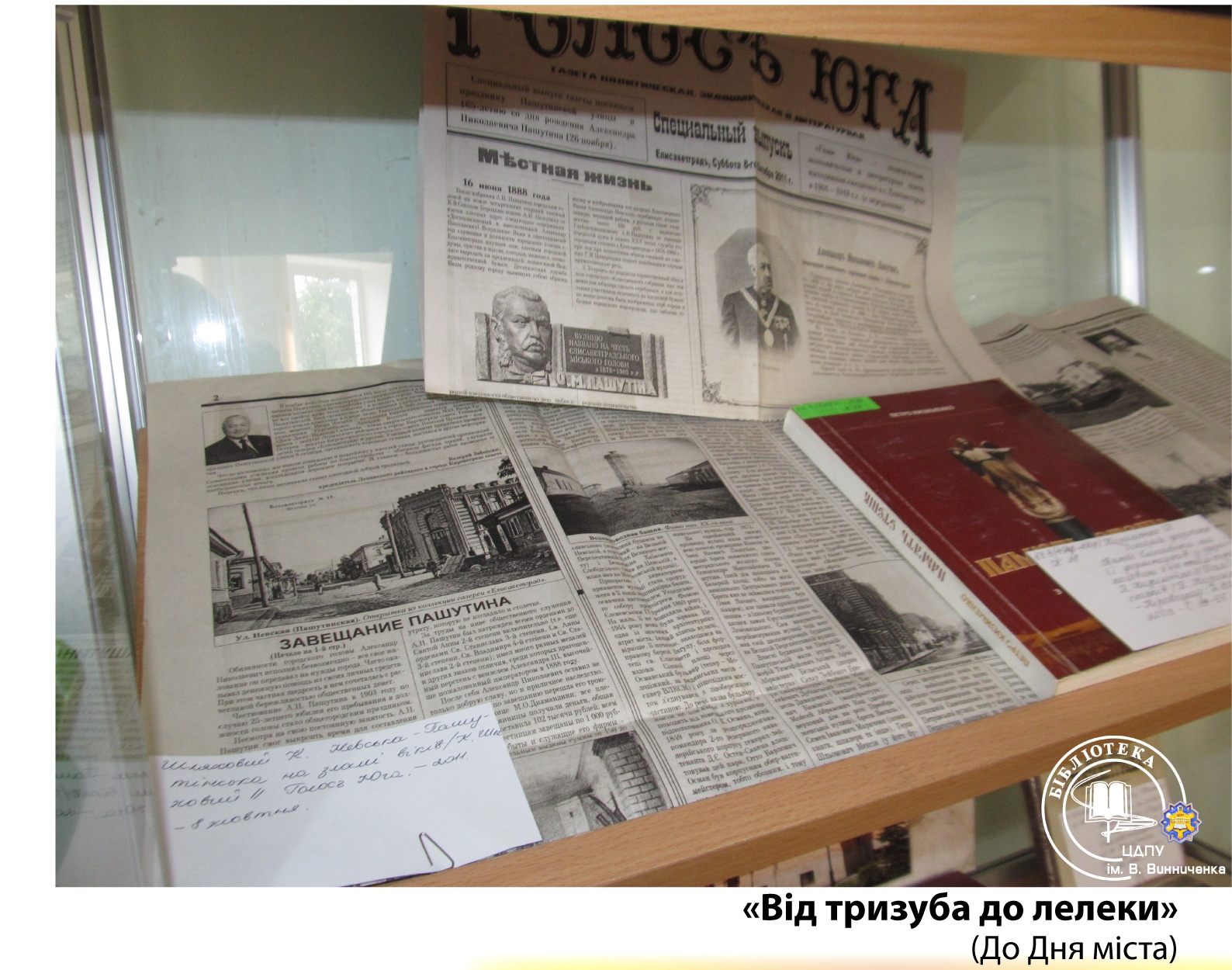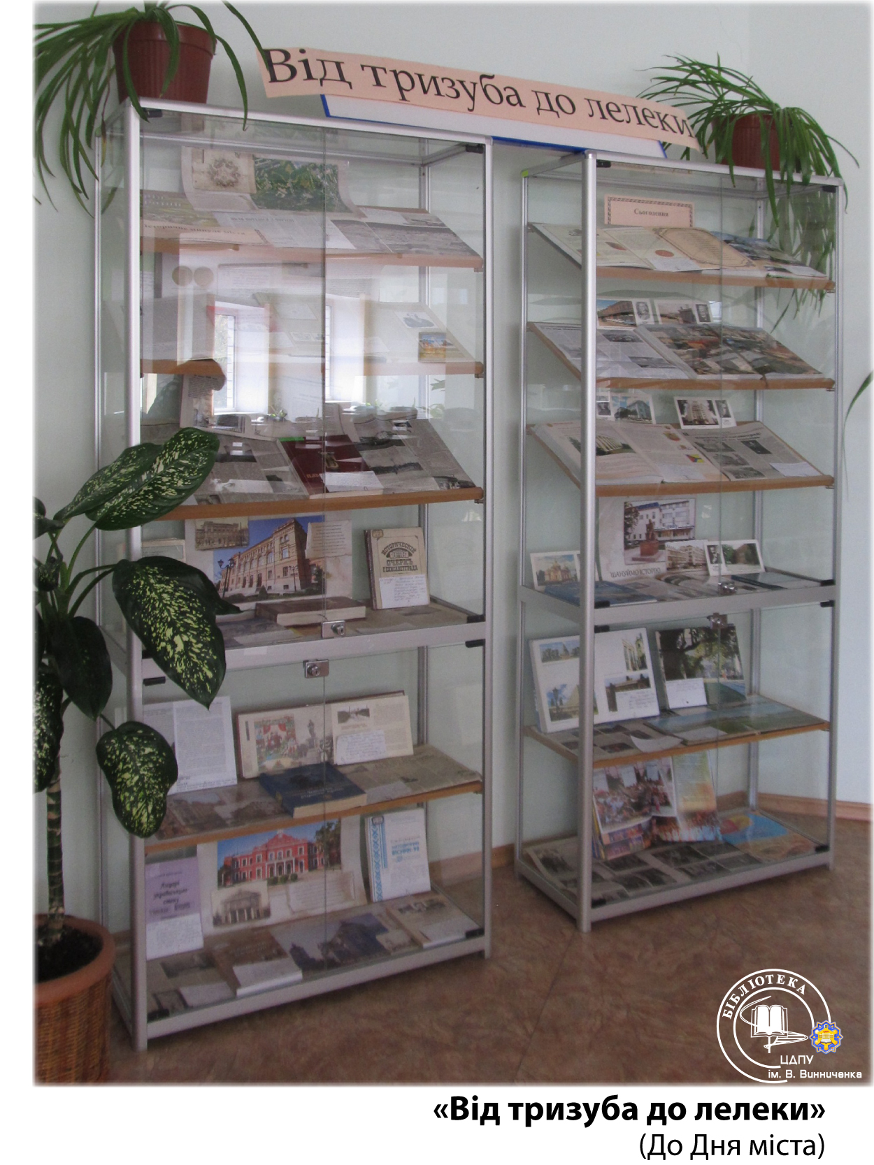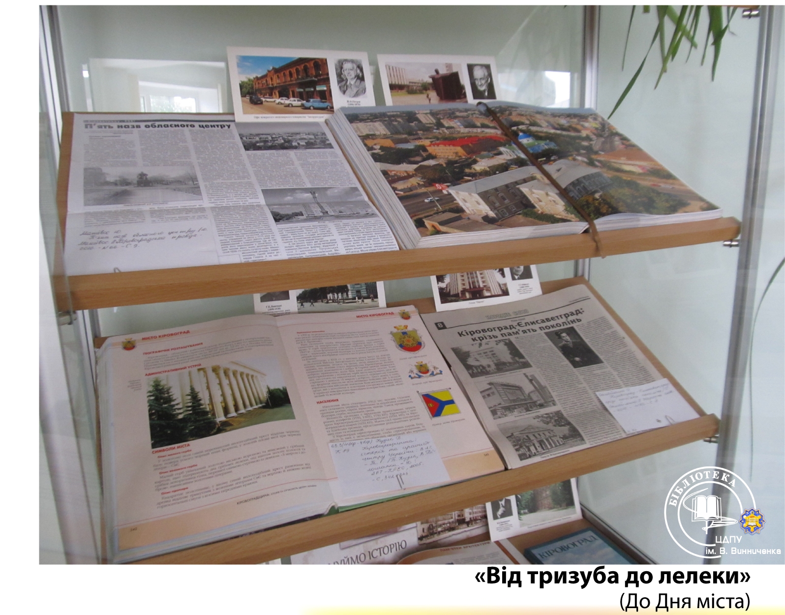 До Дня міста універсальний читальний зал підготував виставку «Від тризуба до лелеки». В матеріалах експозиції ми намагалися представити всі принади нашої малої Батьківщини. У міста над сивим Інгулом складна, надто заплутана історія, особливо в ранній стадії розвитку. Попри це, наше місто дало дуже багато видатних особистостей, як в науці, так і в мистецтві. В нашому рідному домі багато тінистих вулиць, прикрашених чудовими історичними архітектурними спорудами. Парки обласного центру майорять розмаїттям кольорів і буйною зеленню. Затишні кав’ярні припрошують на філіжанку духмяної кави. Завітайте до універсального читального залу для ознайомлення з виставкою.