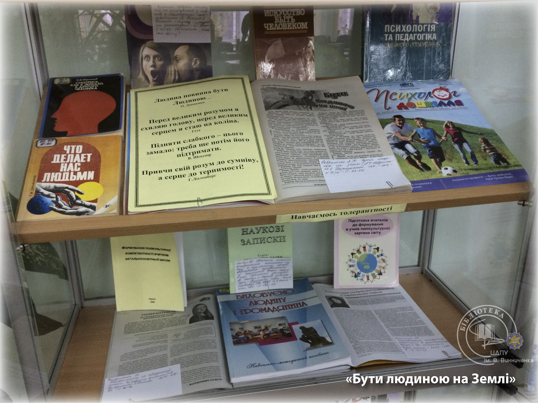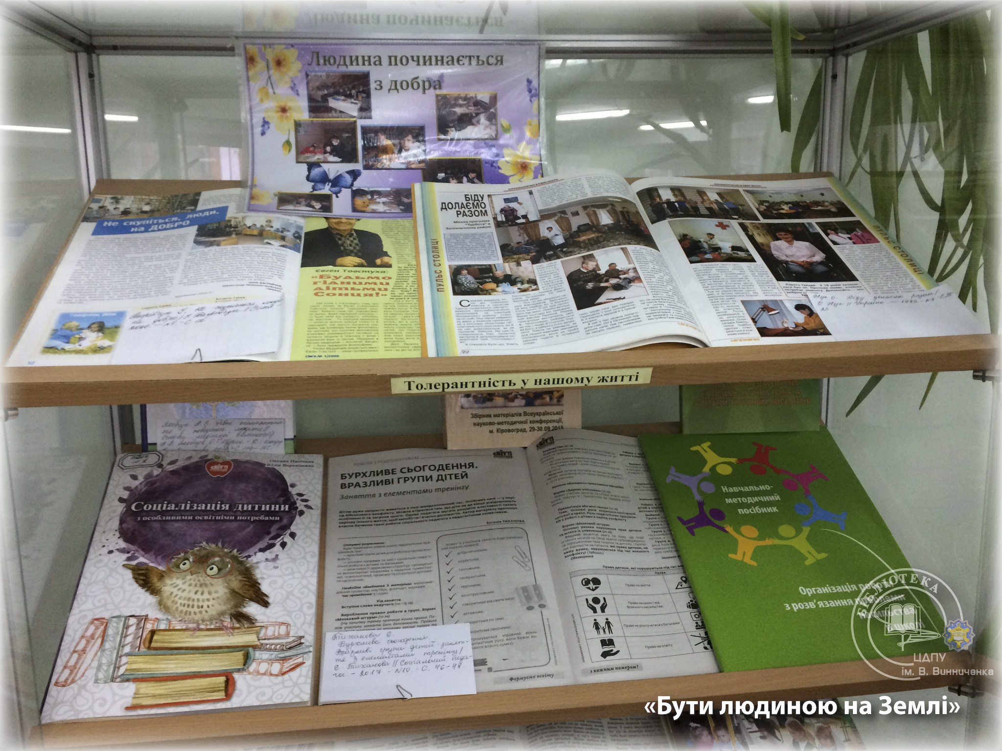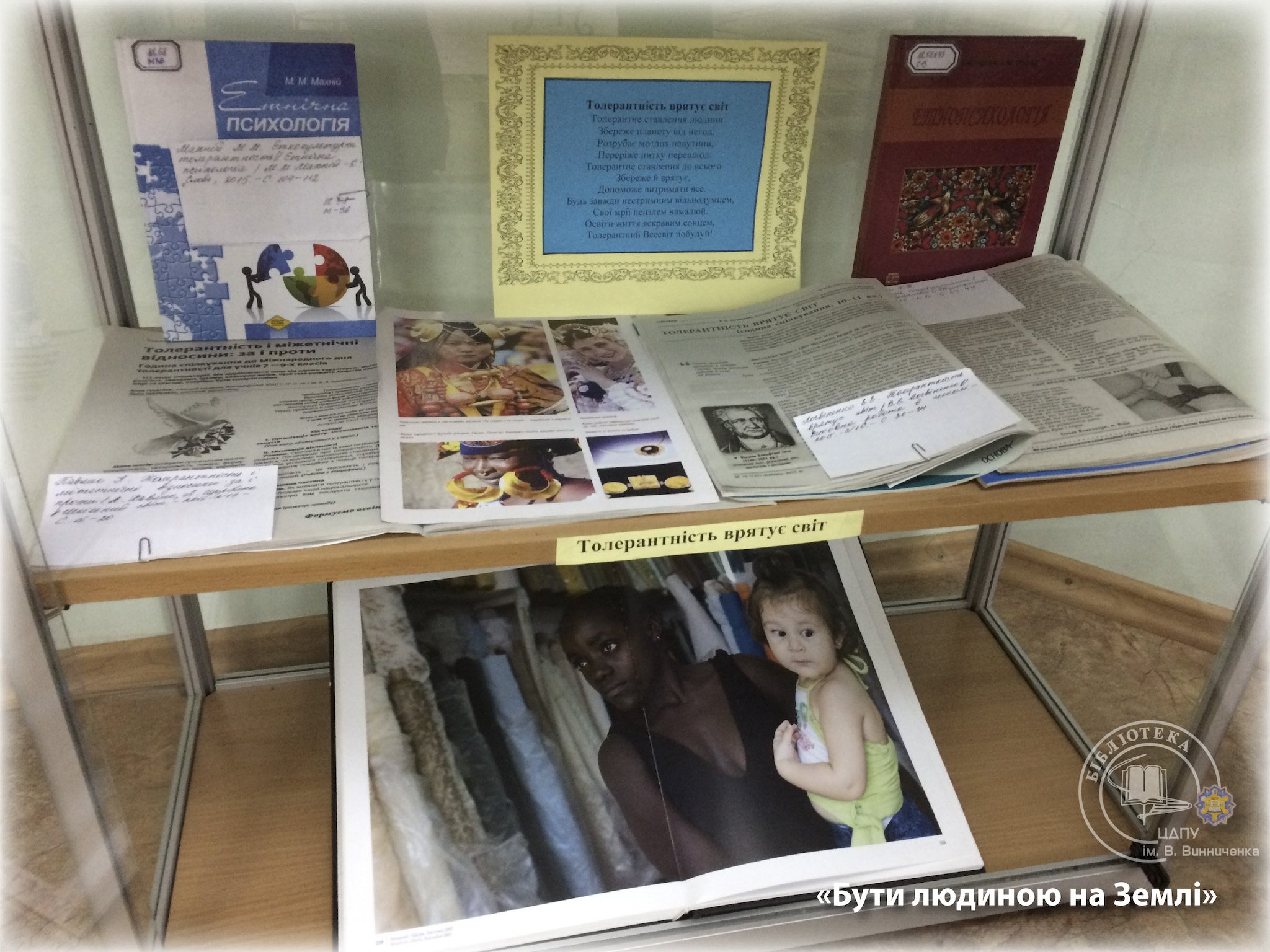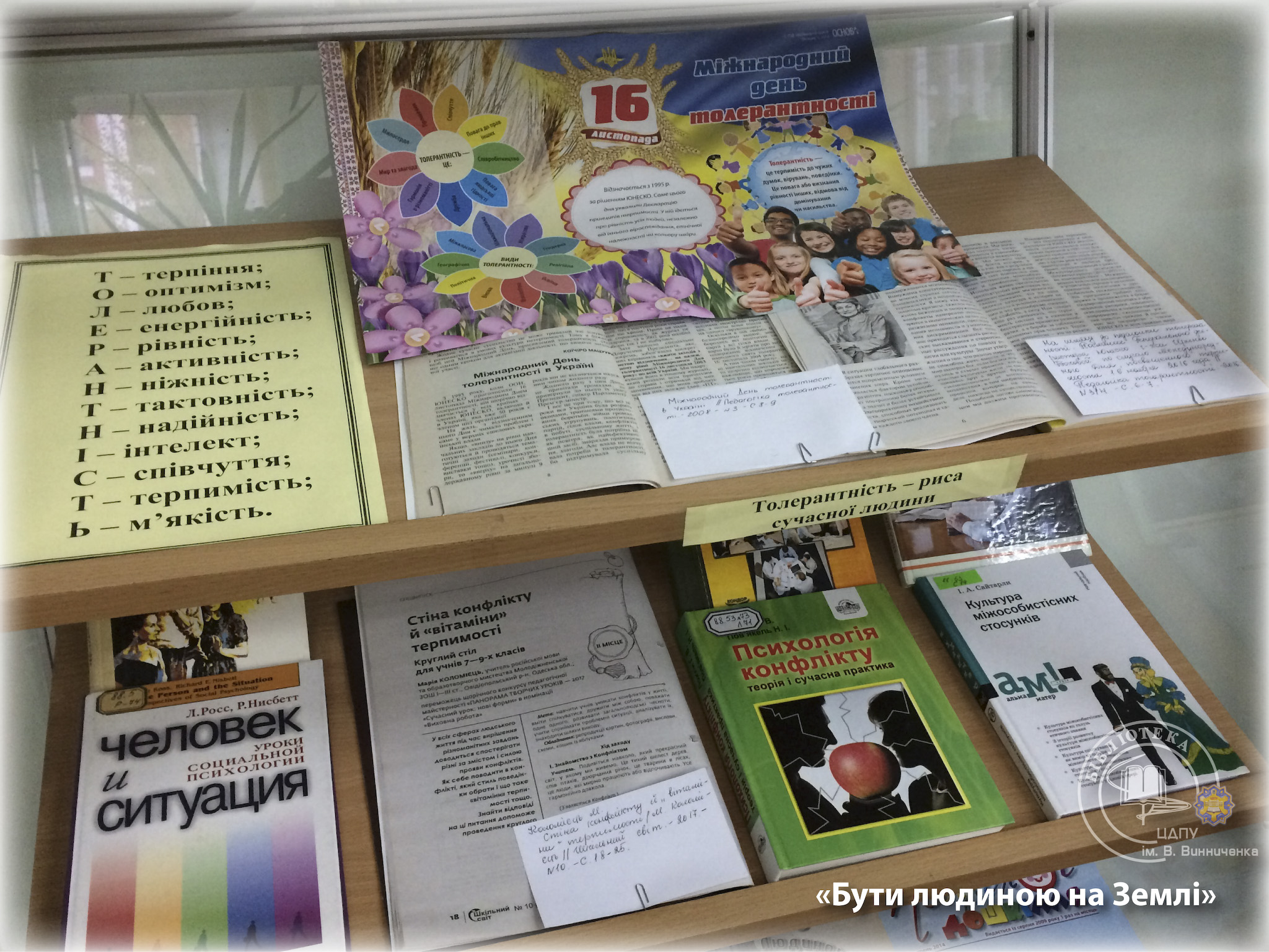 До Міжнародного дня толерантності в універсальному читальному залі експонується виставка «Бути людиною на Землі». Матеріали експозиції знайомлять читача з історією виникнення цього свята. З представленої літератури можна дізнатись про значення даного поняття, про роль толерантності в житті людей, про те, як навчити дитину доброзичливого ставлення до інших.