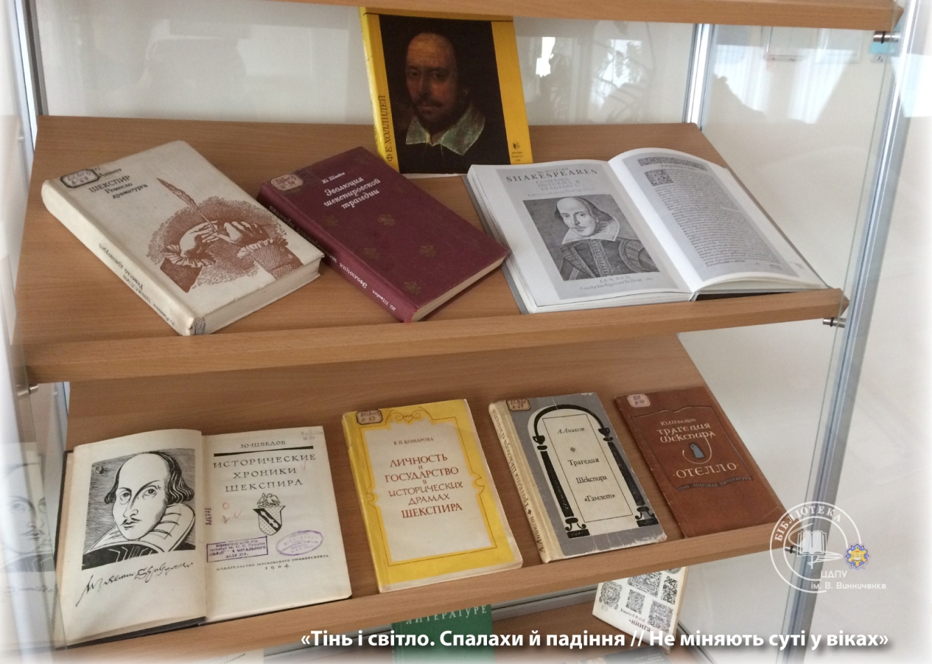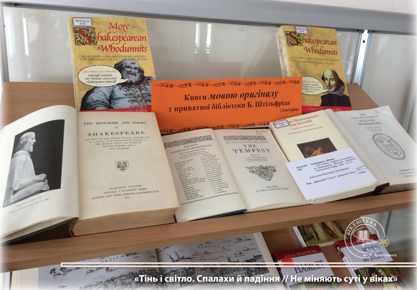 Багатий фактичний матеріал експозиції висвітлює життєвий і творчий шлях митця, критичну інтерпретацію шекспірологів творчої спадщини великого англійського драматурга і поета. До уваги конкурсантів і гостей сонети та трагедії мовою оригіналу, адаптовані видання та художні переклади українських письменників в історичній перспективі.