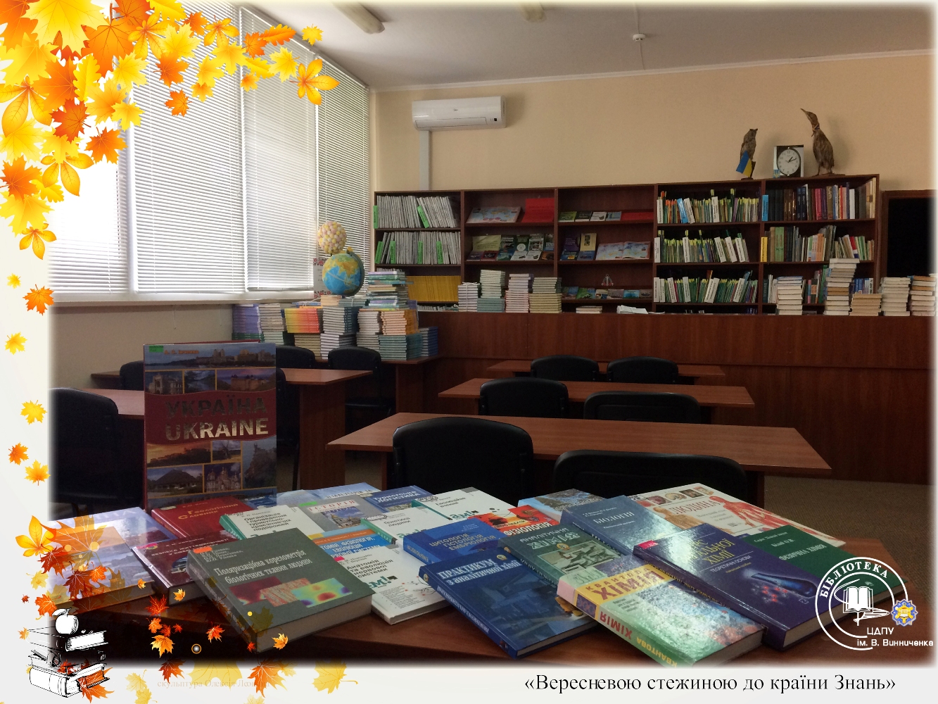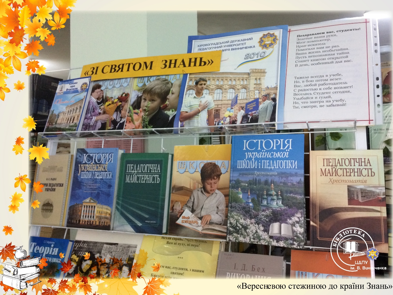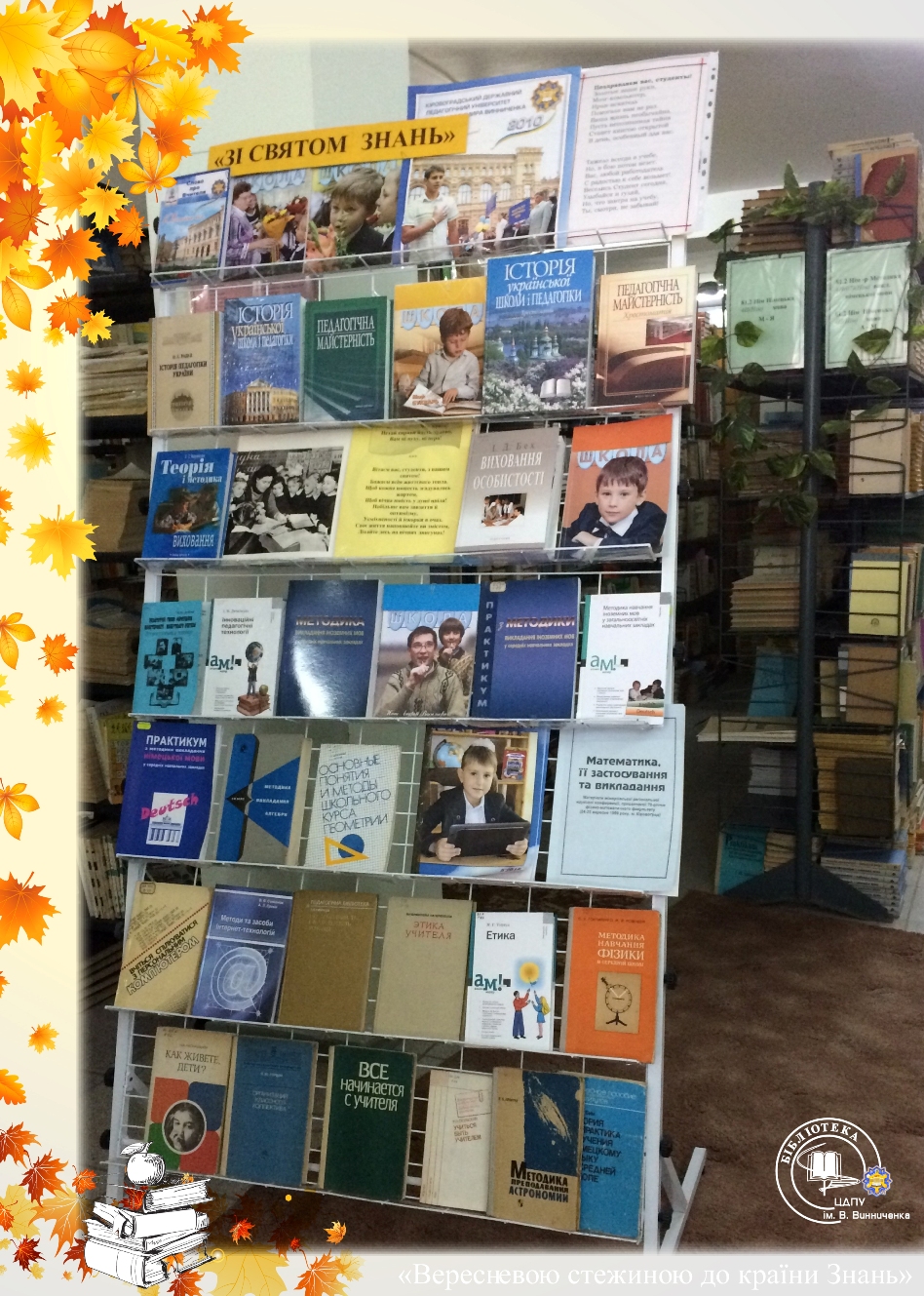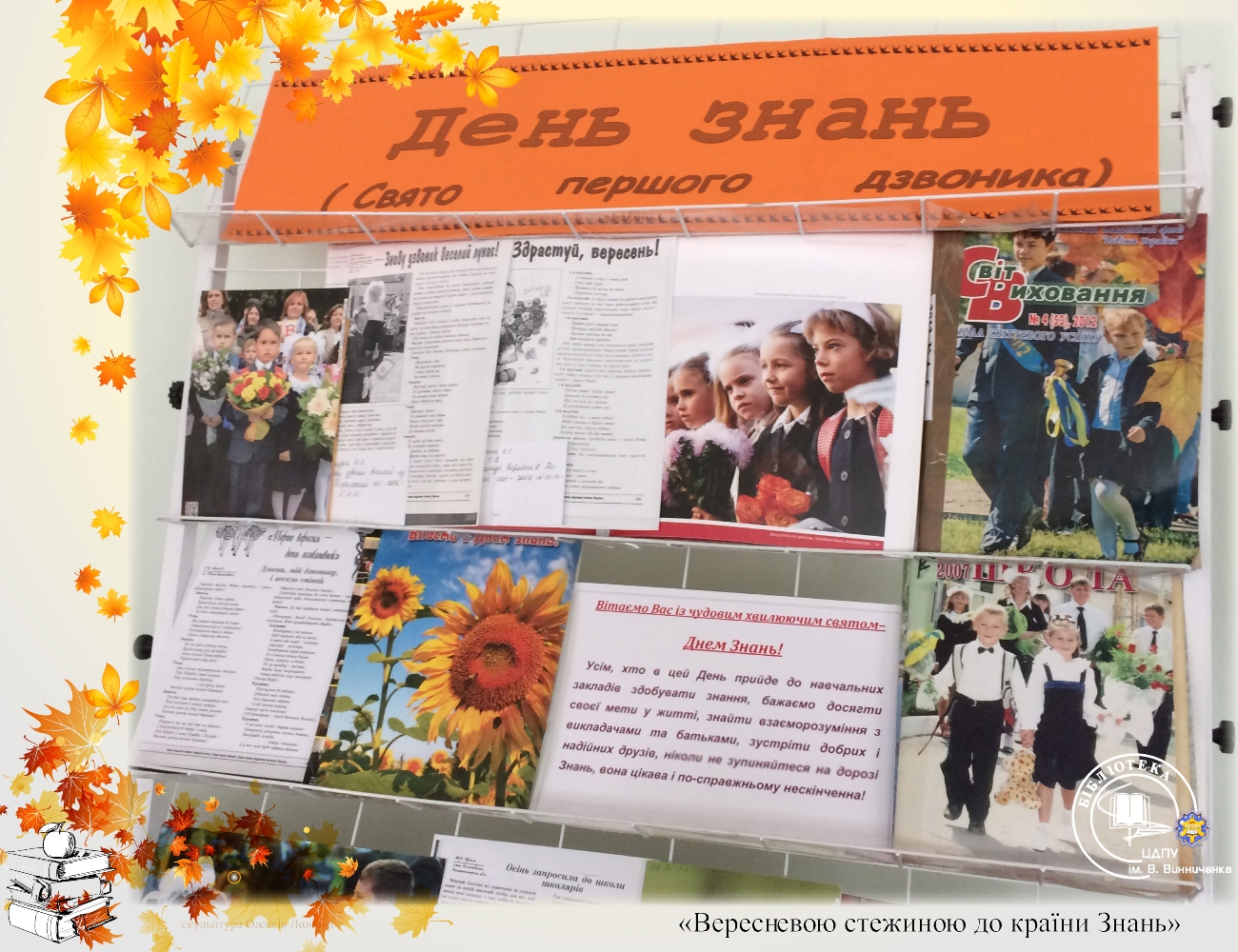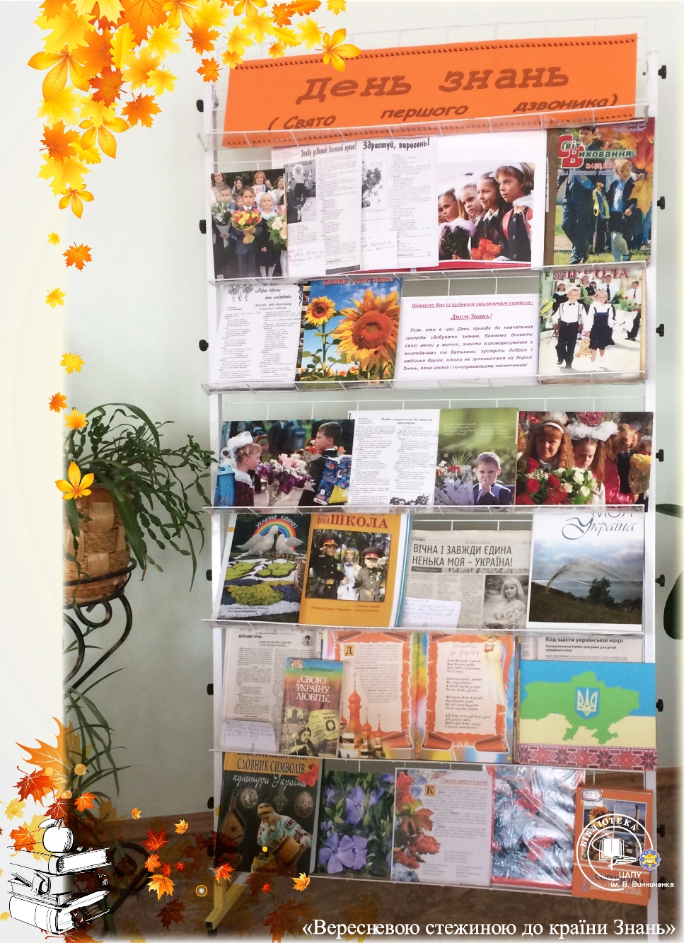 Також до Вашої уваги, шановні читачі, бібліотека пропонує ряд книжкових виставок, присвячених Дню Знань, матеріали першого уроку та нові методичні і навчальні посібники.