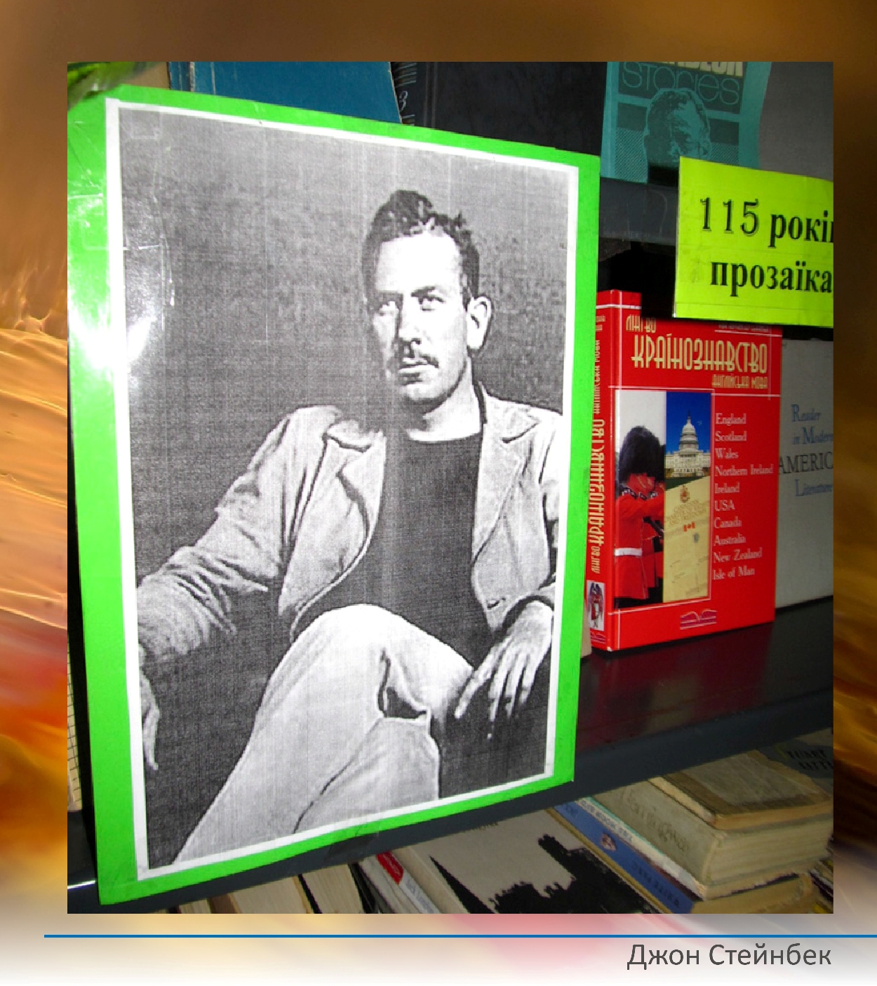 До 115-річчя від дня народження американського письменника Джона Стейнбека працівники абонементу № 2 підготували персональну виставку. На виставці представлені твори автора (як мовою оригіналу, так і в перекладі), критичний матеріал, якій свідчить про життя письменника, його літературну діяльність, творчі досягнення. Запрошуємо всіх бажаючих відвідати виставку та познайомитись із творчістю американського письменника Джона Стейнбека.