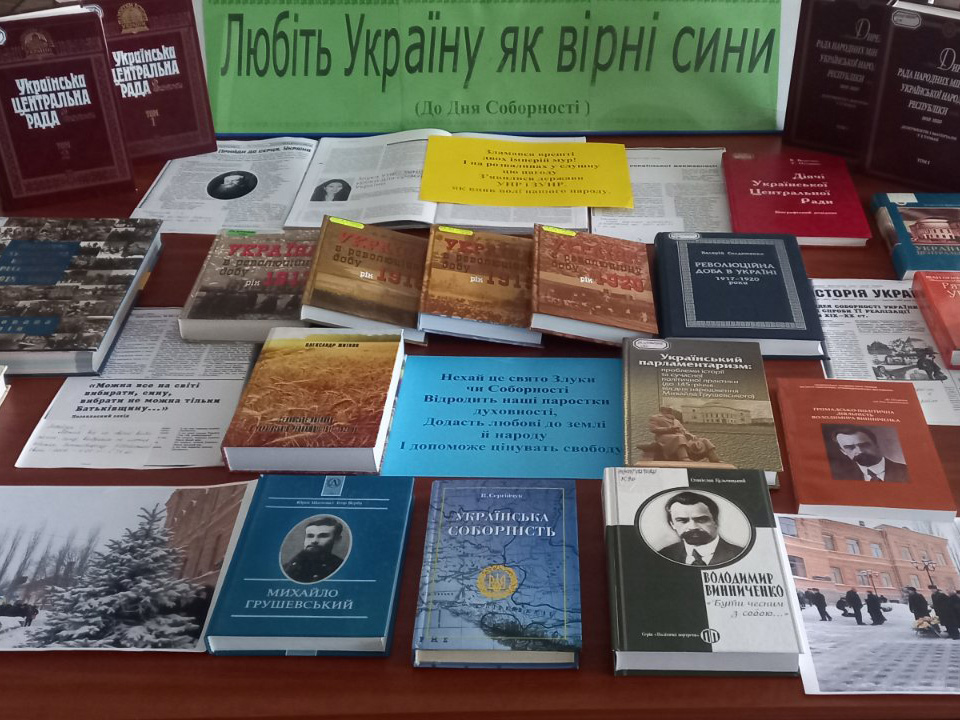 До Дня Соборності України бібліотека презентує книжкову виставку "Любіть Україну, як вірні сини". Матеріали виставки висвітлюють сторінки історії українського державотворення, а також бібліографічні дослідження фундаторів Соборної України. Розділи виставки акцентують увагу на історичних фактах, які передували Акту Злуки та пропонують замислитися над історією нашої країни, над сьогоденням та майбутнім українського народу.