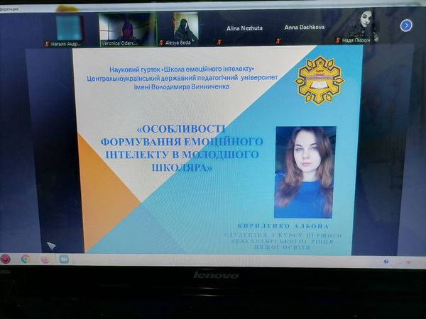 Кириленко А. О., студентка 3 курсу першого (бакалаврського) рівня вищої освіти «ОСОБЛИВОСТІ ФОРМУВАННЯ ЕМОЦІЙНОГО ІНТЕЛЕКТУ В МОЛОДШОМУ ШКІЛЬНОМУ ВІЦІ». Науковий керівник – к.п.н., доцент Т. О. Прибора;