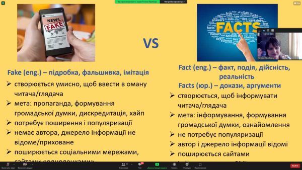 Як перевірити достовірність інформації, віднайти першоджерело, усвідомлювати відповідальність за створення та розповсюдження фейків – про це та багато іншого розповіла доцентка кафедри педагогіки дошкільної та початкової освіти Тетяна Прибора. На прикладах публікацій інформаційно-пропагандистського напряму з іноземних джерел вона розкрила алгоритм пошуку достовірності оприлюднених фактів та фотодокументів, ознайомила із сайтами, які спрямовані на аналіз та спростування фейків. Під час інтерактивного спілкування студенти мали змогу спробувати відшукати показники неправдивості лише з огляду на зовнішні фактори повідомлення.