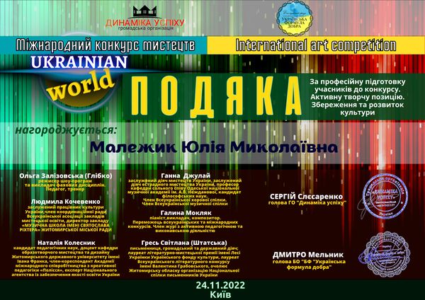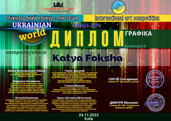 29-30 листопада 2022 року студентка кафедри мистецької освіти, спеціальності «014.12 Середня освіта (Образотворче мистецтво, цифрова графіка та живопис)», групи МО22Б, Катерина Фокша, брала участь у Міжнародному конкурсі мистецтв «UKRAINIAN WORLD». До складу компетентного журі конкурсу входять зірки, професіонали українського та європейського шоу-бізнесу у різних сферах діяльності (образотворчого мистецтва, вокалу, хореографії, моди, театру, кіно, освіти, спорту).