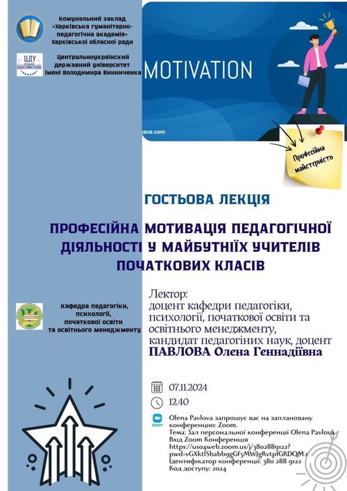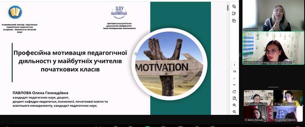 У Центральноукраїнському державному університеті імені Володимира Винниченка для студентів першого (бакалаврського) рівня спеціальності 013 «Початкова освіта» відбулася гостьова лекція в межах курсу «Основи педагогічної майстерності». Лекцію на тему «Професійна мотивація педагогічної діяльності у майбутніх учителів початкових класів» провела Павлова Олена Геннадіївна — кандидатка педагогічних наук, доцентка кафедри педагогіки, психології, початкової освіти та освітнього менеджменту Комунального закладу «Харківська гуманітарно-педагогічна академія» Харківської обласної ради.