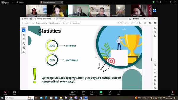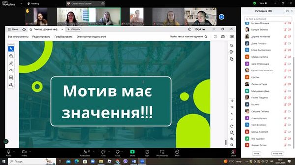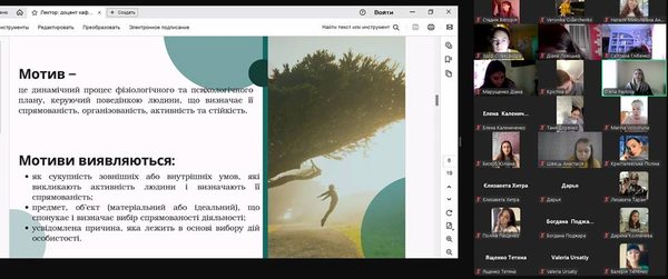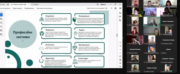 На лекції розглянули основні поняття, пов’язані з професійною мотивацією у сфері педагогіки, зокрема «мотив», «мотиваційна педагогічна діяльність», «професійні мотиви», «етапи професійної мотивації» та «професіограма вчителя». Учасникам також надали практичні рекомендації щодо відновлення професійної мотивації, а для ілюстрації – приклади з досвіду викладачів і студентів різних навчальних закладів.