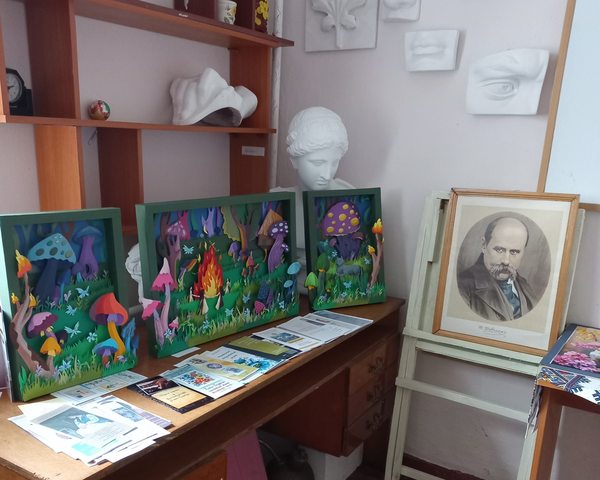 На виставці представлені різноманітні види робіт: графіка, живопис, декоративне мистецтво, паперопластика.