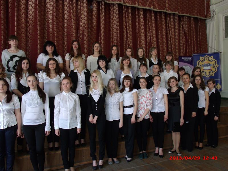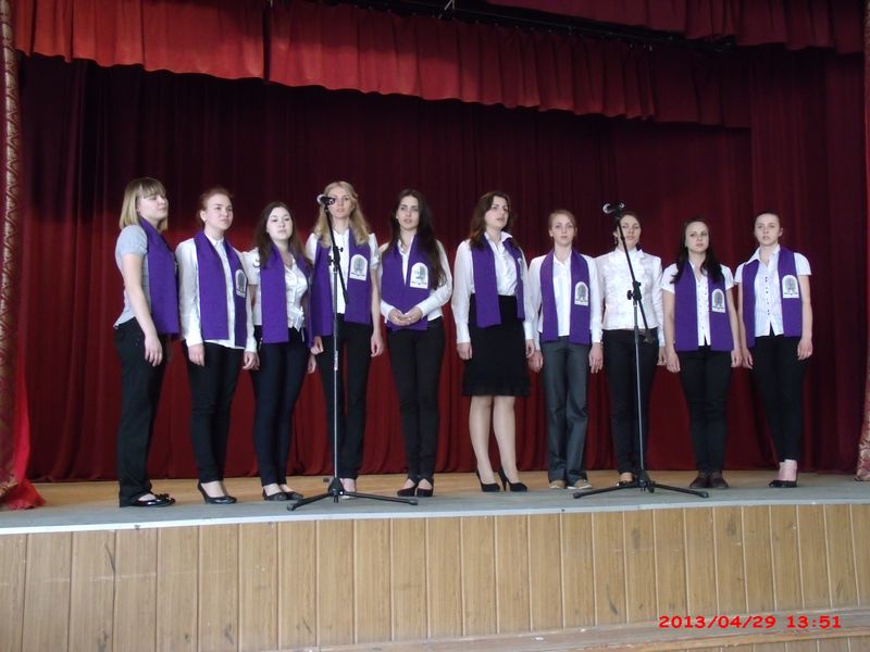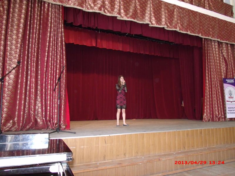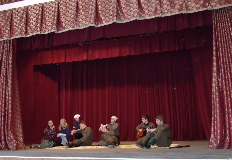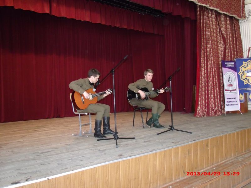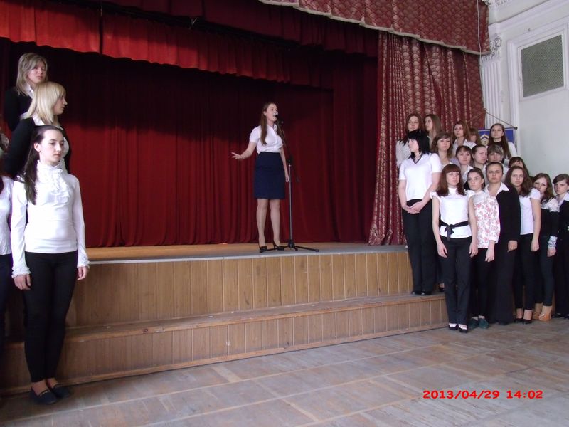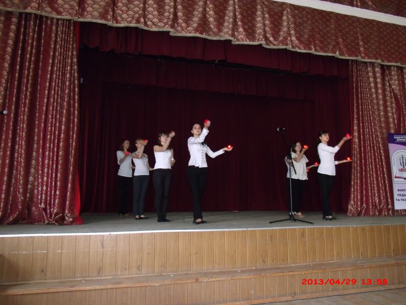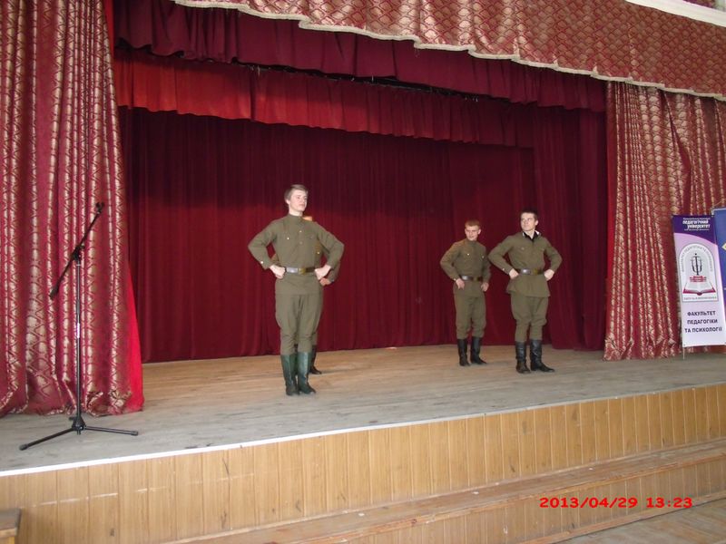 В актовому залі університету, де проходив захід, лунали пісні воєнного часу у виконанні факультетського хору, вокальної групи факультету, окремих студентів. Особливо зворушливо прозвучала пісня «В землянке» із театралізованим супроводом. Студенти гр. 41 виконали танок зі свічами, який символізував вшанування пам’яті тих, хто здобув перемогу в боротьбі із німецькими загарбниками. Після хвилини мовчання було прочитано вірш «Реквієм» та пролунала пісня «День победы» у виконанні хору.
