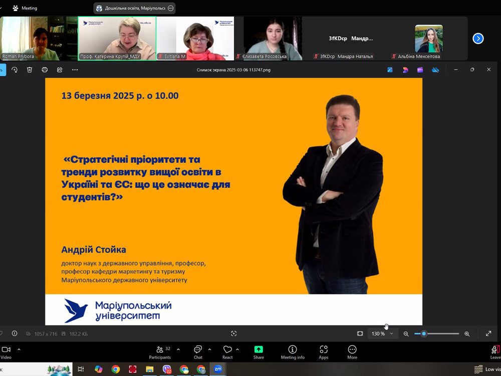 13 березня 2025 року в межах діяльності гуртків за спеціальностями 012 Дошкільна освіта, 013 Початкова освіта студентське наукове товариство «Від гри – до науки» кафедри дошкільної освіти Маріупольського державного університету організувало унікальний вебінар. Темою заходу стала «Стратегічні пріоритети та тренди розвитку вищої освіти в Україні та ЄС: що це означає для студентів?»