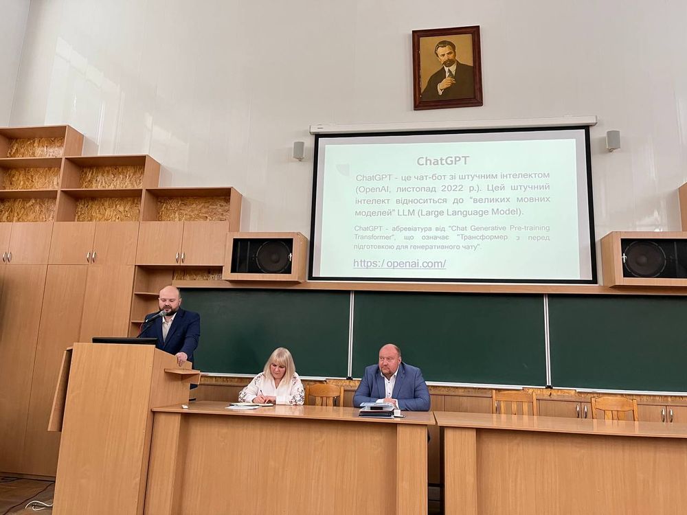 Свої наукові здобутки презентував кандидат педагогічних наук, старший викладач кафедри технологічної та професійної освіти Дмитро Соменко у доповіді «Перспективи використання штучного інтелекту та нейромереж в освіті».