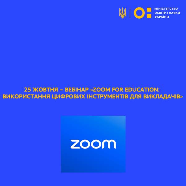 Міністерство освіти і науки України спільно з компанією «Zoom» організовує вебінар «Zoom for Education: використання цифрових інструментів для викладачів». Захід відбудеться 25 жовтня 2022 року о 16:00 на комунікаційній платформі Zoom за посиланням.