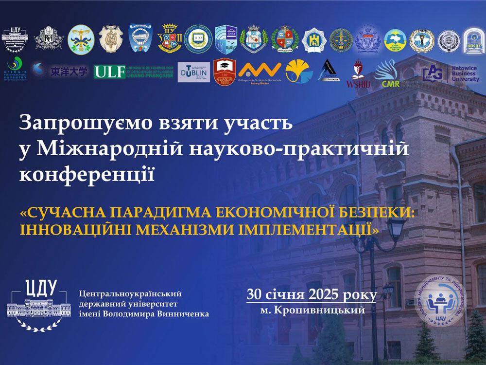 Запрошуємо вас взяти участь у Міжнародній науково-практичній конференції «Сучасна парадигма економічної безпеки: інноваційні механізми імплементації», яка відбудеться 30 січня 2025 року в Центральноукраїнському державному університеті імені Володимира Винниченка (м. Кропивницький).