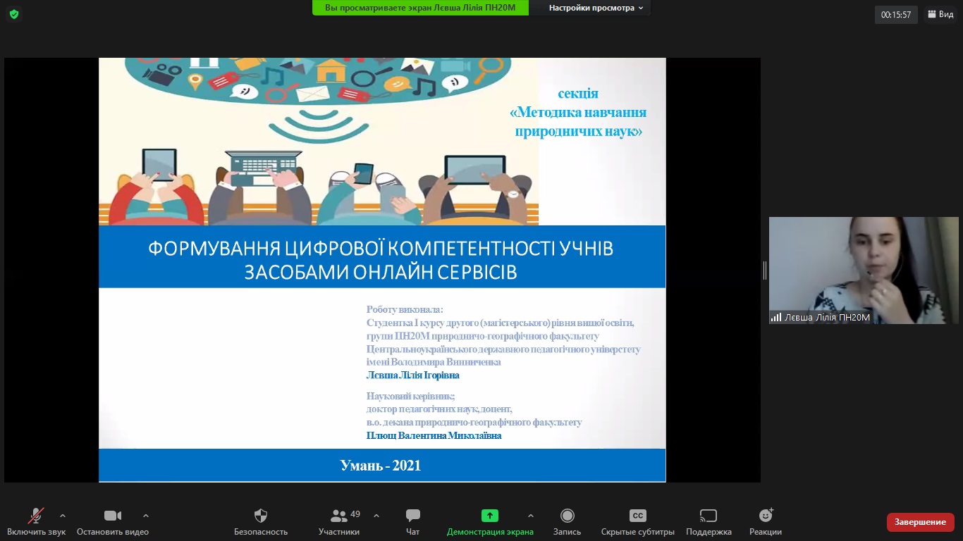 У своєму завершальному слові, під час підведення підсумків роботи конференції, в.о. декана природничо-географічного факультету доктор педагогічних наук, доцент Плющ В.М. подякувала доповідачам, науковим керівникам та оргкомітету, а також підтвердила високий науковий рівень представлених робіт та різноманіття напрямків і тематики досліджень, які здійснюються на факультеті.