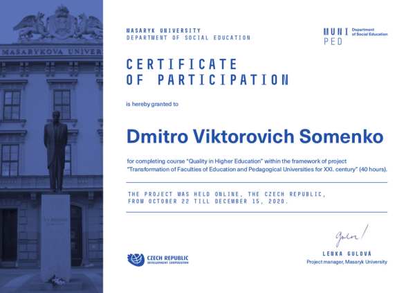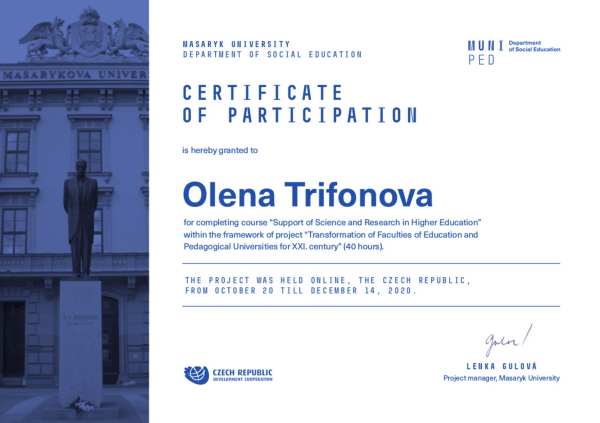 Протягом жовтня – грудня 2020 року молоді вчені ЦДПУ (д.пед.н. О.М.Трифонова та к.пед.н. Д.В.Соменко) підвищували свою компетентність в рамка міжнародного проекту «Transformation of Faculties of Education and Pedagogical Universities for XXI. Century». Вони стали учасниками двох онлайн курсів «Quality in Higher Education» та «Support of Science and Research in Higher Education».