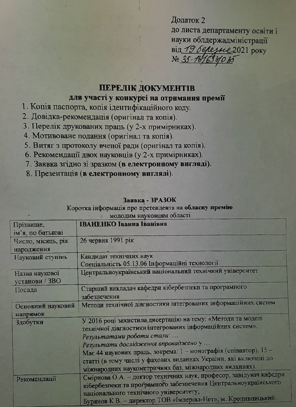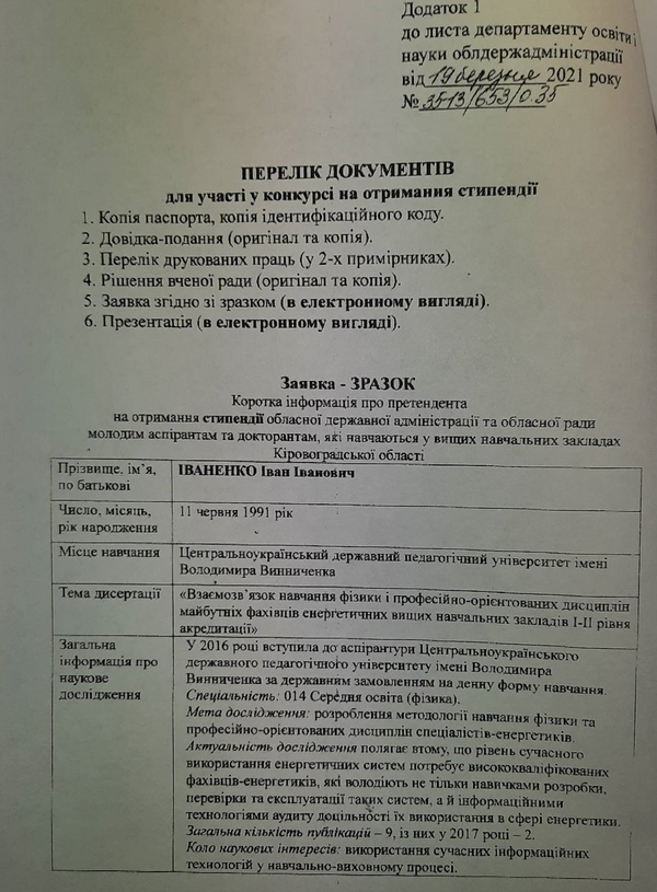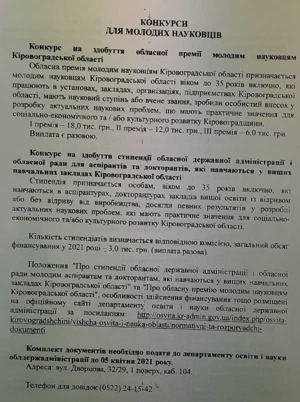 Кіровоградська обласна державна адміністрація оголосила щорічний конкурс на здобуття обласної премії молодим науковцям Кіровоградської області та стипендії обласної державної адміністрації і обласної ради для аспірантів та докторантів, які навчаються у закладах вищої освіти Кіровоградської області.