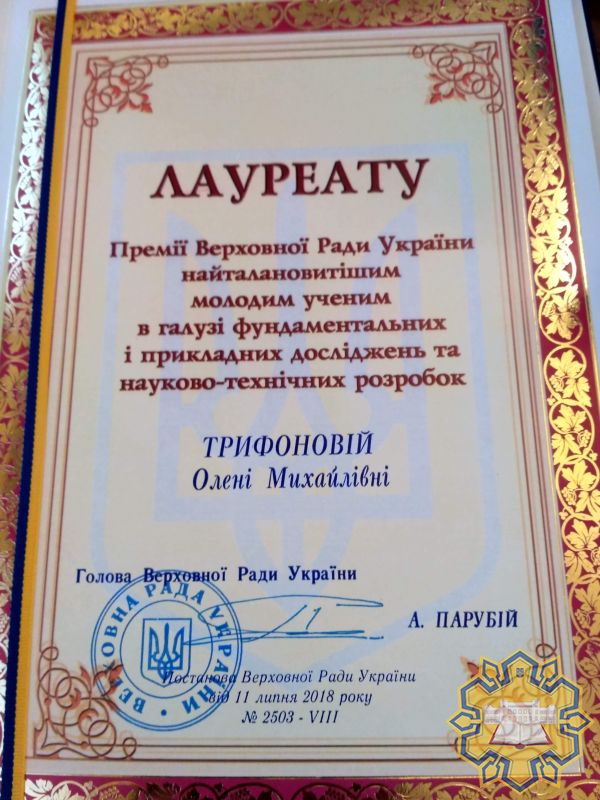 На здобуття Премії Верховної Ради для найталановитіших молодих учених в галузі фундаментальних і прикладних досліджень та науково-технічних розробок за 2017 рік від Центральноукраїнського державного педагогічного університету імені Володимира Винниченка було висунуто роботу О.М.Трифонової на тему «ОСОБЛИВОСТІ НЕСТАНДАРТНОЇ ІННОВАЦІЙНОЇ СИСТЕМИ І.Є. ТАММА – ЛАУРЕАТА НОБЕЛІВСЬКОЇ ПРЕМІЇ З ФІЗИКИ – З ФОРМУВАННЯ ТЕОРЕТИЧНОГО МИСЛЕННЯ ТВОРЧОЇ ОСОБИСТОСТІ ТА ПАТРІОТИЗМУ», яка і увійшла у двадцятку переможців.