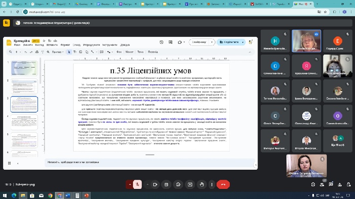 Оксана Петрівна підготувала кейс із прикладами опису підкритеріїв критерію 5 звіту самоаналізу та звернула увагу учасників семінару на позитивні практики чіткості і зрозумілості форм контрольних заходів та критеріїв оцінювання навчальних досягнень. Наталія Подопригора продемонструвала приклад відображення критеріїв оцінювання навчальних досягнень студентів на платформі Google Classroom.