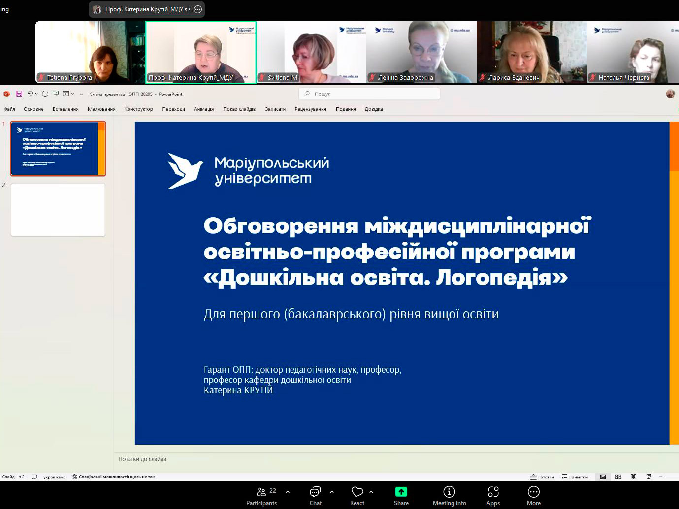 У межах забезпечення якості вищої освіти та у відповідь на виклики сучасного суспільства 17 квітня 2024 року доцент кафедри дошкільної та початкової освіти Прибора Т.О. взяла участь у обговорення міждисциплінарної освітньо-професійної програми «Дошкільна освіта. Логопедія». Гарант ОПП Крутій К.Л. Програма створена на перетині двох предметних областей – дошкільної педагогіки та логопедії, що дозволяє інтегрувати педагогічні, психологічні та клінічні знання з метою підготовки висококваліфікованих фахівців, здатних ефективно працювати з дітьми дошкільного віку, зокрема з особливими освітніми потребами.