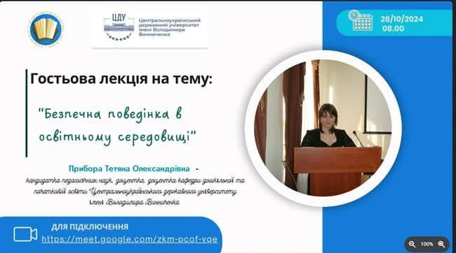 8 жовтня 2024 року на базі Комунального закладу «Харківська гуманітарно-педагогічна академія» Харківської обласної ради було проведено гостьову лекцію для здобувачів освіти 411-по групи першого (бакалаврського) рівня спеціальності 013 Початкова освіта на тему «Безпечна поведінка в освітньому середовищі» та студентів групи ДО21Б спеціальності 012 Дошкільна освіта ЦДУ ім. В. Винниченка, що має особливу значущість в умовах цифровізації освіти та зростання кількості кіберризиків для дітей молодшого шкільного віку.