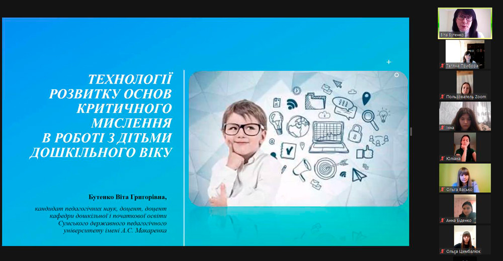 11 квітня 2024 р. на платформі Zoom в межах співробітництва між закладами проведено гостьову кандидаткою педагогічних наук, доценткою, доценткою кафедри дошкільної і початкової освіти Сумського державного педагогічного університету Бутенко Вітою Григорівною на тему «Технології розвитку основ критичного мислення в роботі з дітьми дошкільного віку» для здобувачів спеціальності 012 Дошкільна освіта першого (бакалаврського) рівня та другого (магістерського) рівня.