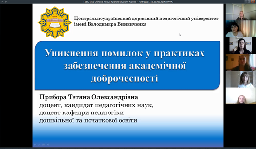 1 жовтня 2020 року відбулася міжвузівська лекція для здобувачів освіти магістерського рівня спеціальностей 013 Початкова освіта та 012 Дошкільна освіта Центральноукраїнського державного педагогічного університету імені Володимира Винниченка та Комунального закладу «Харківська гуманітарно-педагогічна академія» Харківської обласної ради на тему «Уникнення помилок у практиках забезпечення академічної доброчесності».