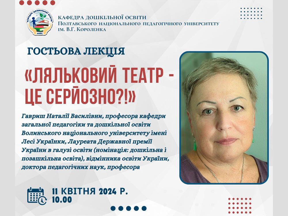 11 квітня 2024 року здобувачі спеціальностей 012 Дошкільна освіта першого (бакалаврського) рівня та другого (магістерського) рівня та 013 Початкова освіта першого (бакалаврського) рівня та другого (магістерського) рівня і викладачі кафедри педагогіки дошкільної та початкової освіти Баранюк Ірина Григорівна, Горська Олена Олександрівна, Прибора Тетяна Олександрівна відвідали гостьову лекцію професора кафедри загальної педагогіки та дошкільної освіти Волинського національного університету імені лесі Українки, Лауреата Державної премії України в галузі освіти (номінація: дошкільна і позашкільна освіта), відмінника освіти України, доктора педагогічних наук, професора Наталії Василівни Гавриш.