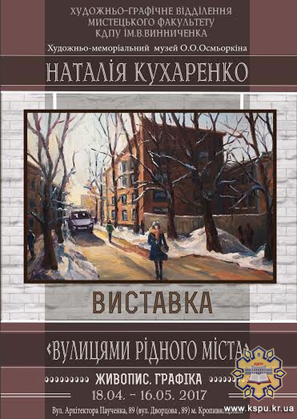 Під цією назвою 18 квітня 2017 року в художньо-меморіальному музеї Олександра Осмьоркіна відкрилась персональна виставка магістрантки художньо-графічного відділення мистецького факультету Наталії Кухаренко (куратор виставки канд. мист-ва, доц. О.І.Кириченко). Виставка є частиною великого проекту індивідуальної роботи студента під керівництвом викладача, який триває протягом двох років. Тема архітектури міста була основою випускної кваліфікаційної роботи Н.Кухаренко на ступень бакалавра («Архітектурна деталь як виразний елемент художнього стилю»), де вона створила серію робіт із зображенням архітектурних деталей історичної частини міста, а також комплект листівок «Єлисаветград/Кіровоград в архітектурних деталях». За цей комплект Н.Кухаренко і науковий керівник О.І.Кириченко у вересні 2016 року отримали Свідоцтво про авторське право.