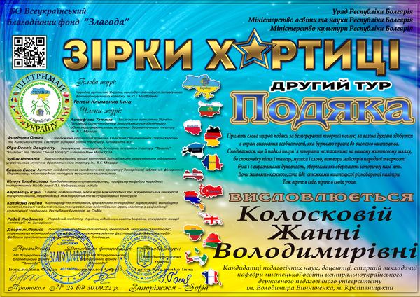 Євген Власов, студент ІV курсу спеціальності 014. Середня освіта. Музичне мистецтво, став лауреатом 1 ступеня у номінації "Диригенти" Міжнародного багатожанрового фестивалю-конкурсу "Зірки Хортиці", який проходив 27-28 серпня 2022 р. у Запоріжжі за сприяння БО Благодійного фонду "Злагода". Колектив кафедри мистецької освіти вітає з перемогою Євгена Власова, а також його викладача - к.п.н., доц., старшого викладача Колоскову Ж.В. та акомпаніатора Говор Л.С. Бажаємо здоров'я, наснаги та подальших успіхів на творчій ниві.