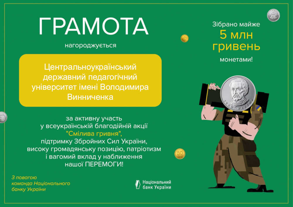 За активну участь у всеукраїнській благодійній акції "Смілива гривня", підтримку Збройних Сил України, високу громадянську позицію, патріотизм та вагомий вклад у наближення нашої перемоги Центральноукраїнський державний педагогічний університет імені Володимира Винниченка відзначено ГРАМОТОЮ від Національного Банку України.
