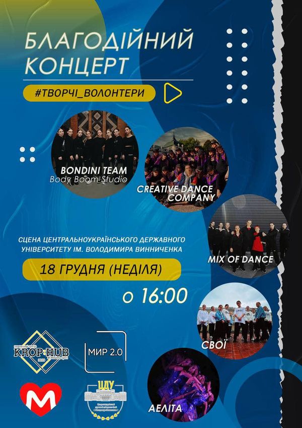 18 грудня 2022 року Центральноукраїнський державний університет імені Володимира Винниченка приймав гостей — актова зала нашого закладу стала майданчиком для проведення благодійного концерту у рамках ініціативи «Творчі волонтери», що її втілюють у життя активісти організацій «Ветерани війни Кропивницького», «Серця матерів» та «Krop:hub Кропивницький».