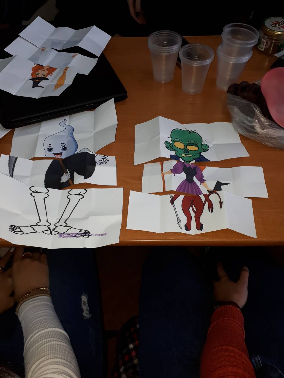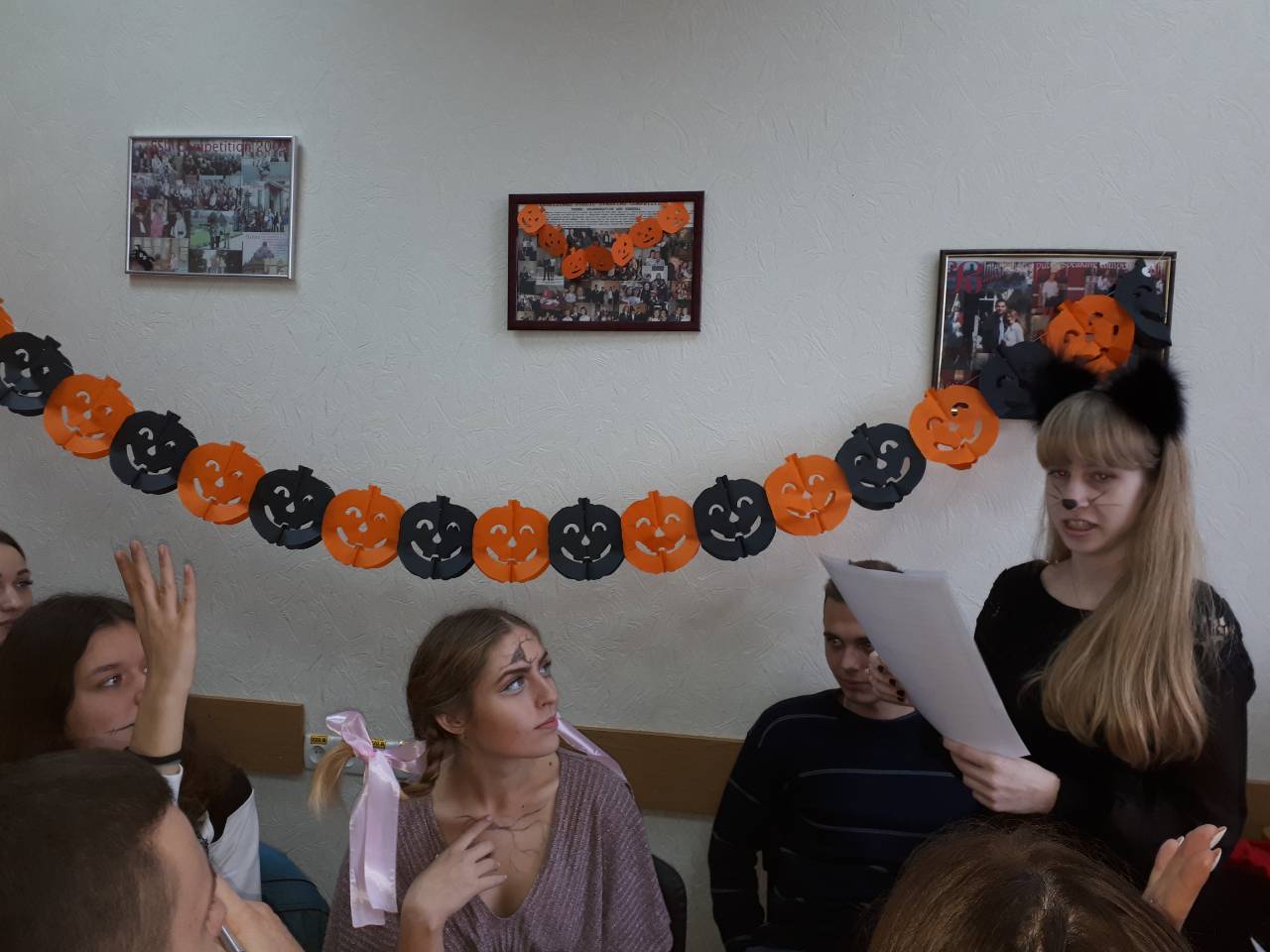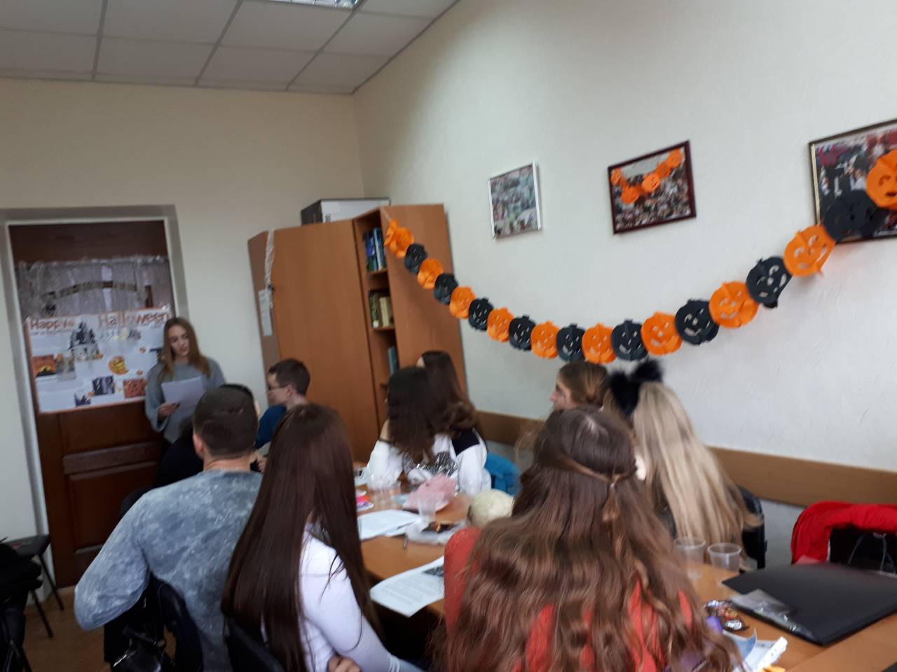 Спочатку з доповіддю про історію Halloween виступив студент групи Клименко Антон. Після доповіді Антон продемонстрував відео про історію цього свята. Після цього виступила студентка Полтавець Катерина, яка розповіла цікаві факти щодо Halloween. Наступною виступила Азза Катерина, яка також розповіла цікаві факти про це свято. Після виступу Катерина показала відео під назвою «Bet You Didn't Know». В свою чергу, староста групи Бойко Аліна розповіла про те, як святкують Halloween в різних країнах. Катерина Головіна підготувала плакат та доповідь про 10 символів Halloween. Після Катерини виступив Тимофій Вашека, який підготував презентацію під назвою «What is Halloween and can our country celebrate it?». На цьому теоретична частина була завершена.