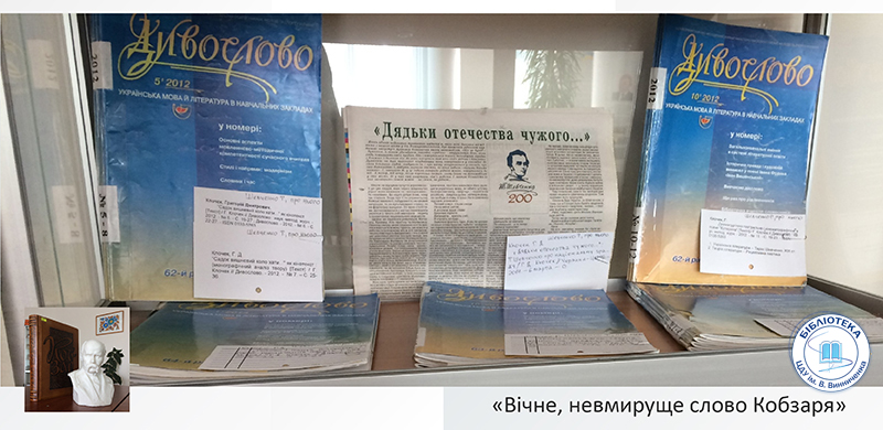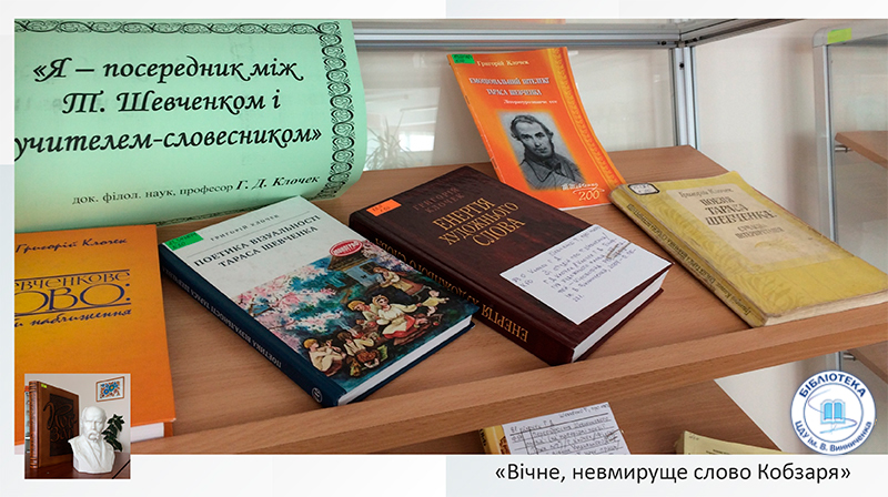 Окремий розділ виставки знайомить з науково-практичним доробком відомого літературознавця в галузі шевченкознавства та шкільного літературознавства доктора філологічних наук, професора Г. Д. Клочека. Всі зацікавлені мають змогу переглянути праці науковця, в яких подано аналіз поетики, інтерпретація текстів та філософія творчості українського генія.