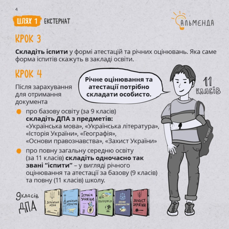 - сприяють проведенню річного оцінювання та державної підсумкової атестації заявника з української мови та історії України, видачі йому документів державного зразка про базову середню освіту або повну загальну середню освіту (здійснюється уповноваженим закладом загальної середньої освіти);
