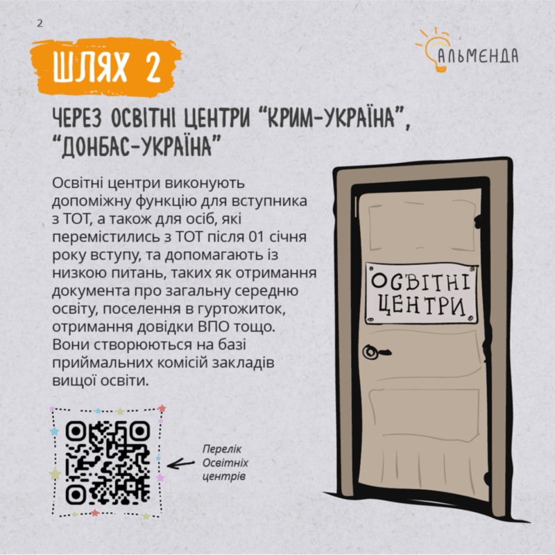 В освітні центри «Крим-Україна» та «Донбас–Україна» на базі приймальної комісії ЦДУ ім. В.Винниченка (м. Кропивницький, вул. Шевченка, 1, корпус 5, кабінет 103). Заявники можуть звернутися до освітніх центрів особисто або дистанційно, за допомогою електронної форми чи інших каналів зв’язку: